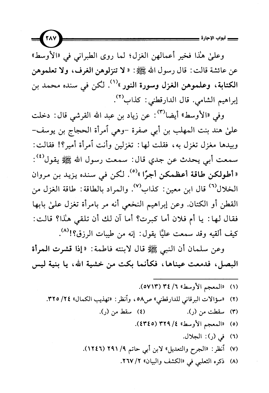 وفي "الأوسط" أيضا (¬3): عن زياد بن عبد الله القرشي قال: دخلت على هند بنت المهلب بن أبي صفرة -وهي امرأة الحجاج بن يوسف- وبيدها مغزل تغزل به، فقلت لها: تغزلين وأنت امرأة أمير؟ ! فقالت: سمعت أبي يحدث عن جدي قال: سمعت رسول الله - صلى الله عليه وسلم - يقول (¬4): "أطولكن طاقة أعظمكن أجرًا" (¬5). لكن في سنده يزيد بن مروان الخلال (¬6) قال ابن معين: كذاب (¬7). والمراد بالطاقة: طاقة الغزل من القطن أو الكتان. وعن إبراهيم النخعي أنه مر بامرأة تغزل على بابها فقال لها: يا أم فلان أما كبرت؟ أما أن لك أن تلقي هذا؟ قالت: كيف ألقيه وقد سمعت عليَّا يقول: إنه من طيبات الرزق؟ ! (¬8).