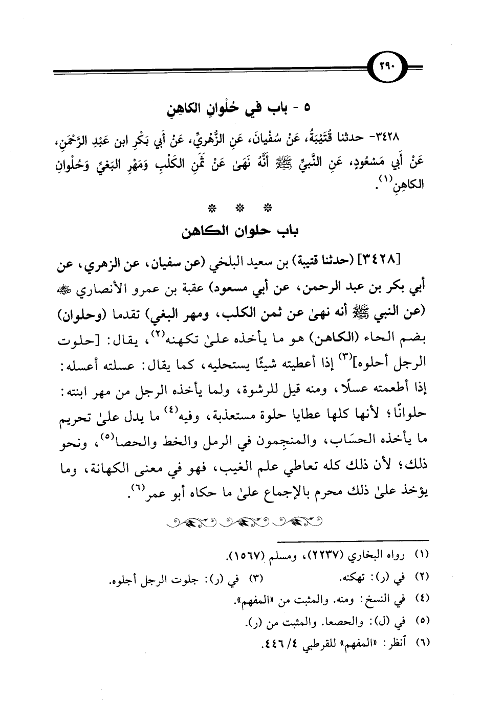 3428 - حدثنا قُتَيْبَةُ، عَنْ سُفْيانَ، عَنِ الزُّهْريِّ، عَنْ أَبي بَكْرِ ابن عَبْدِ الرَّحْمَنِ، عَنْ أبِي مَسْعُودٍ، عَنِ النَّبيِّ - صلى الله عليه وسلم - أَنَّهُ نَهَى عَنْ ثَمَنِ الكَلْبِ وَمَهْرِ البَغيِّ وَحُلْوانِ الكاهِنِ (¬1).