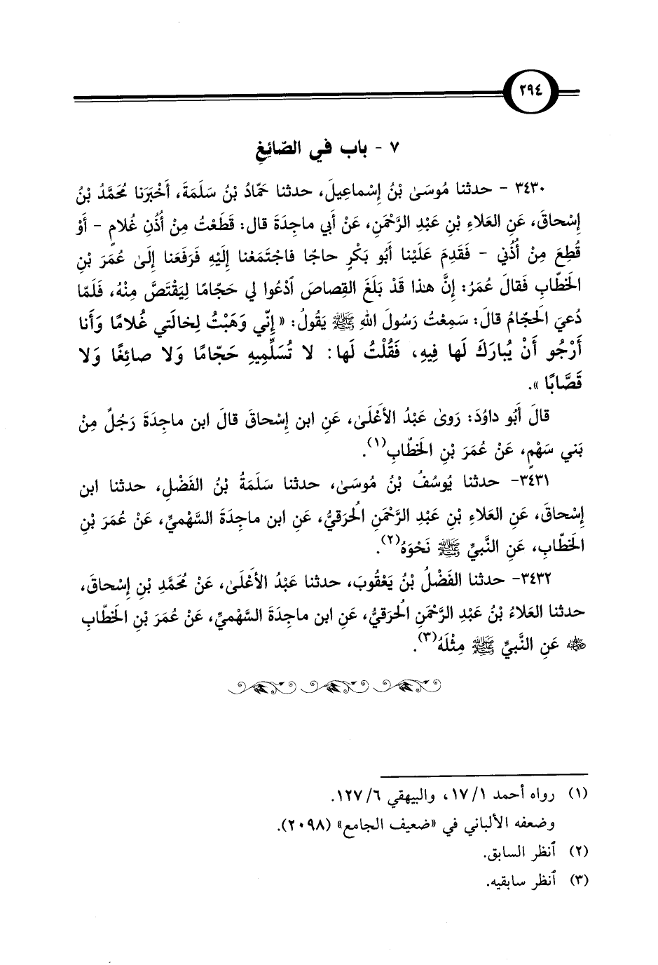 3431 - حدثنا يُوسُفُ بْنُ مُوسَى، حدثنا سَلَمَةُ بْنُ الفَضْلِ، حدثنا ابن إِسْحاقَ، عَنِ العَلاءِ بْنِ عَبْدِ الرَّحْمَنِ الحُرَقيُّ، عَنِ ابن ماجِدَةَ السَّهْميِّ، عَنْ عُمَرَ بْنِ الخَطّابِ، عَنِ النَّبيِّ - صلى الله عليه وسلم - نَحْوَهُ (¬2).