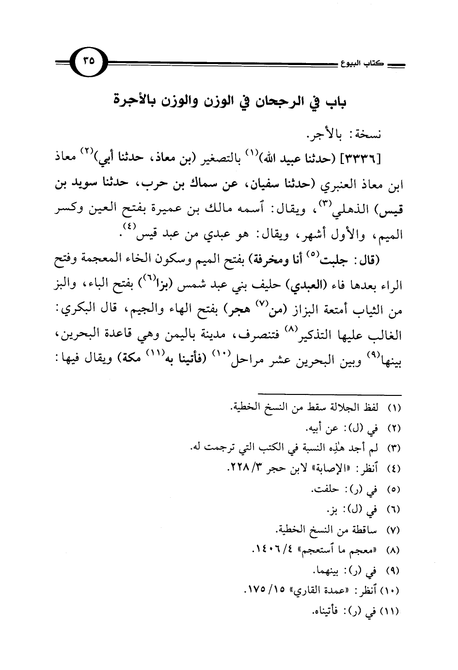(قال: جلبت (¬5) أنا ومخرفة) بفتح الميم وسكون الخاء المعجمة وفتح الراء بعدها فاء (العبدي) حليف بني عبد شمس (بزا) (¬6) بفتح الباء، والبز من الثياب أمتعة البزاز (من (¬7) هجر) بفتح الهاء والجيم، قال البكري: الغالب عليها التذكير (¬8) فتنصرف، مدينة باليمن وهي قاعدة البحرين، بينها (¬9) وبين البحرين عشر مراحل (¬10) (فأتينا به (¬11) مكة) ويقال فيها: