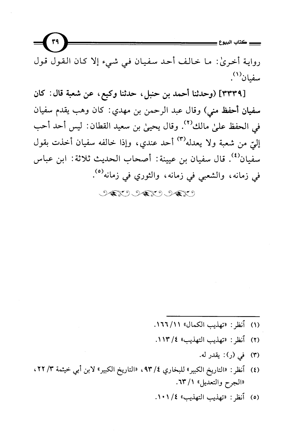 [3339] (وحدثنا أحمد بن حنبل، حدثنا وكيع، عن شعبة قال: كان سفيان أحفظ مني) وقال عبد الرحمن بن مهدي: كان وهب يقدم سفيان في الحفظ على مالك (¬2). وقال يحيى بن سعيد القطان: ليس أحد أحب إليّ من شعبة ولا يعدله (¬3) أحد عندي، وإذا خالفه سفيان أخذت بقول سفيان (¬4). قال سفيان بن عيينة: أصحاب الحديث ثلاثة: ابن عباس في زمانه، والشعبي في زمانه، والثوري في زمانه (¬5).