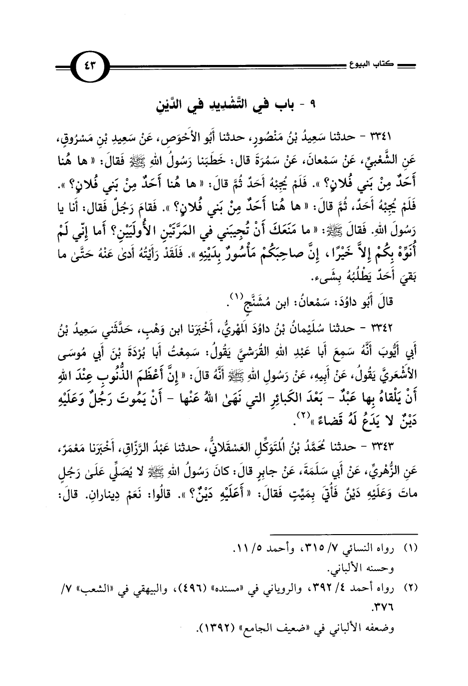 3341 - حدثنا سَعِيدُ بْنُ مَنْصُورٍ، حدثنا أَبُو الأحوَصِ، عَنْ سَعِيدِ بْنِ مَسْرُوقٍ، عَنِ الشَّعْبيِّ، عَنْ سَمْعانَ، عَنْ سَمُرَةَ قال: خَطَبَنا رَسُولُ اللهِ - صلى الله عليه وسلم - فَقالَ: "ها هُنا أَحَدٌ مِنْ بَني فُلانٍ؟ ". فَلَمْ يُجبْهُ أَحَدٌ ثمَّ قالَ: "ها هُنا أَحَدٌ مِنْ بَني فُلانٍ؟ ". فَلَمْ يُجبْهُ أَحَدٌ، ثُمَّ قالَ: "ها هُنا أَحَدٌ مِنْ بَني فُلانٍ؟ ". فَقامَ رَجُلٌ فَقال: أَنا يا رَسُولَ اللهِ. فَقالَ - صلى الله عليه وسلم -: "ما مَنَعَكَ أَنْ تُجِيبَني في المَرَّتَيْنِ الأُولَيَيْنِ؟ أَما إِنّي لَمْ أُنَوِّهْ بِكُمْ إِلاَّ خَيْرًا، إِنَّ صاحِبَكُمْ مَأْسُورٌ بِدَيْنِهِ". فَلَقَدْ رَأَيْتُهُ أَدى عَنْهُ حَتَّى ما بَقيَ أَحَدٌ يَطْلُبُهُ بِشَيء.