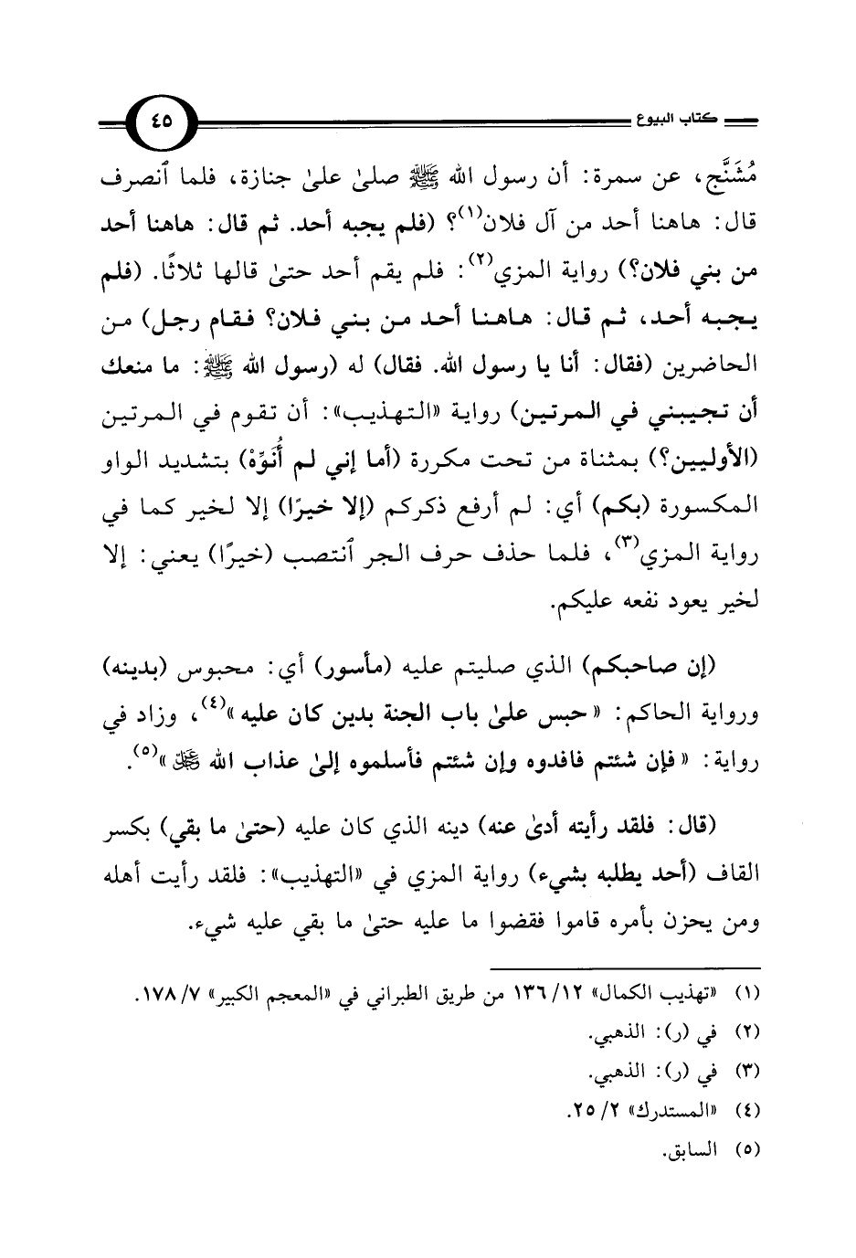 مُشَنَّج، عن سمرة: أن رسول الله - صلى الله عليه وسلم - صلى على جنازة، فلما انصرف قال: هاهنا أحد من آل فلان (¬1)؟ (فلم يجبه أحد. ثم قال: هاهنا أحد من بني فلان؟ ) رواية المزي (¬2): فلم يقم أحد حتى قالها ثلاثًا. (فلم يجبه أحد، ثم قال: هاهنا أحد من بني فلان؟ فقام رجل) من الحاضرين (فقال: أنا يا رسول الله. فقال) له (رسول الله - صلى الله عليه وسلم -: ما منعك أن تجيبني في المرتين) رواية "التهذيب": أن تقوم في المرتين (الأوليين؟ ) بمثناة من تحت مكررة (أما إني لم أُنَوِّهْ) بتشديد الواو المكسورة (بكم) أي: لم أرفع ذكركم (إلا خيرًا) إلا لخير كما في رواية المزي (¬3)، فلما حذف حرف الجر انتصب (خيرًا) يعني: إلا لخير يعود نفعه عليكم.