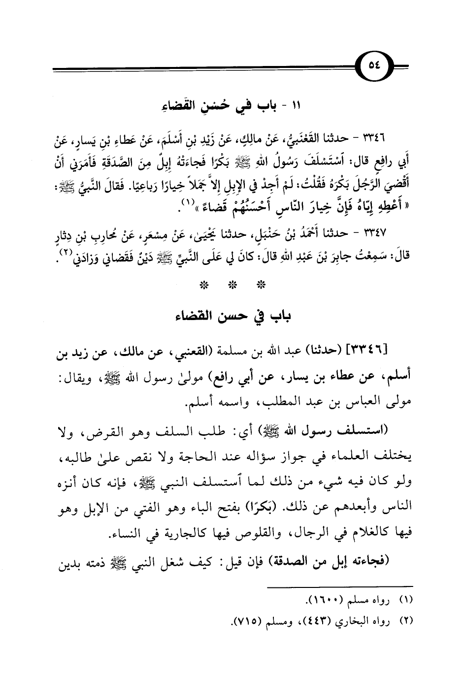 3346 - حدثنا القَعْنَبيُّ، عَنْ مالِكٍ، عَنْ زَيْدِ بْنِ أَسْلَمَ، عَنْ عَطَاءِ بْنِ يَسارٍ، عَنْ أَبى رافِعٍ قال: اسْتَسْلَفَ رَسُول اللهِ - صلى الله عليه وسلم - بَكْرًا فَجاءَتْهُ إِبِلٌ مِنَ الصَّدَقَةِ فَأَمَرَنى أَنْ أَقْضيَ الرَّجُلَ بَكْرَهُ فَقُلْتُ: لَمْ أَجِدْ في الإِبِلِ إِلاَّ جَمَلًا خِيارًا رَباعِيًّا. فَقالَ النَّبيُّ - صلى الله عليه وسلم -: "أَعْطِهِ إيَّاهُ فَإِنَّ خِيارَ النّاسِ أَحْسَنُهُمْ قَضاءً" (¬1).
