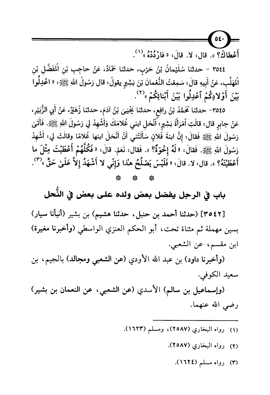 3545 - حدثنا محَمَّد بْنُ رافِعٍ، حدثنا يَحْيَى بْنُ آدَمَ، حدثنا زُهَيْرٌ، عَنْ أَبي الزُّبَيْرِ، عَنْ جابِرٍ قال: قالَتِ امْرَأَةُ بَشِيرٍ: انْحَلِ ابني غُلامَكَ وَأَشْهِدْ لي رَسُولَ اللهِ - صلى الله عليه وسلم -. فَأَتَى رَسُولَ اللهِ - صلى الله عليه وسلم - فَقالَ: إِنَّ ابنةَ فُلانٍ سَأَلتْني أَنْ أَنْحَلَ ابنها غُلامًا وقالَتْ لي: أَشْهِدْ رَسُولَ اللهِ - صلى الله عليه وسلم -. فَقالَ: "لَهُ إِخْوَةٌ؟ ". فَقال: نَعَمْ. قالَ: "فَكُلَّهُمْ أَعْطَيْتَ مِثْلَ ما أَعْطَيْتَهُ؟ ". قال: لا. قالَ: "فَلَيْسَ يَصْلُحُ هذا وَإِنّي لا أَشْهَدُ إِلَّا عَلَى حَقٍّ" (¬3).