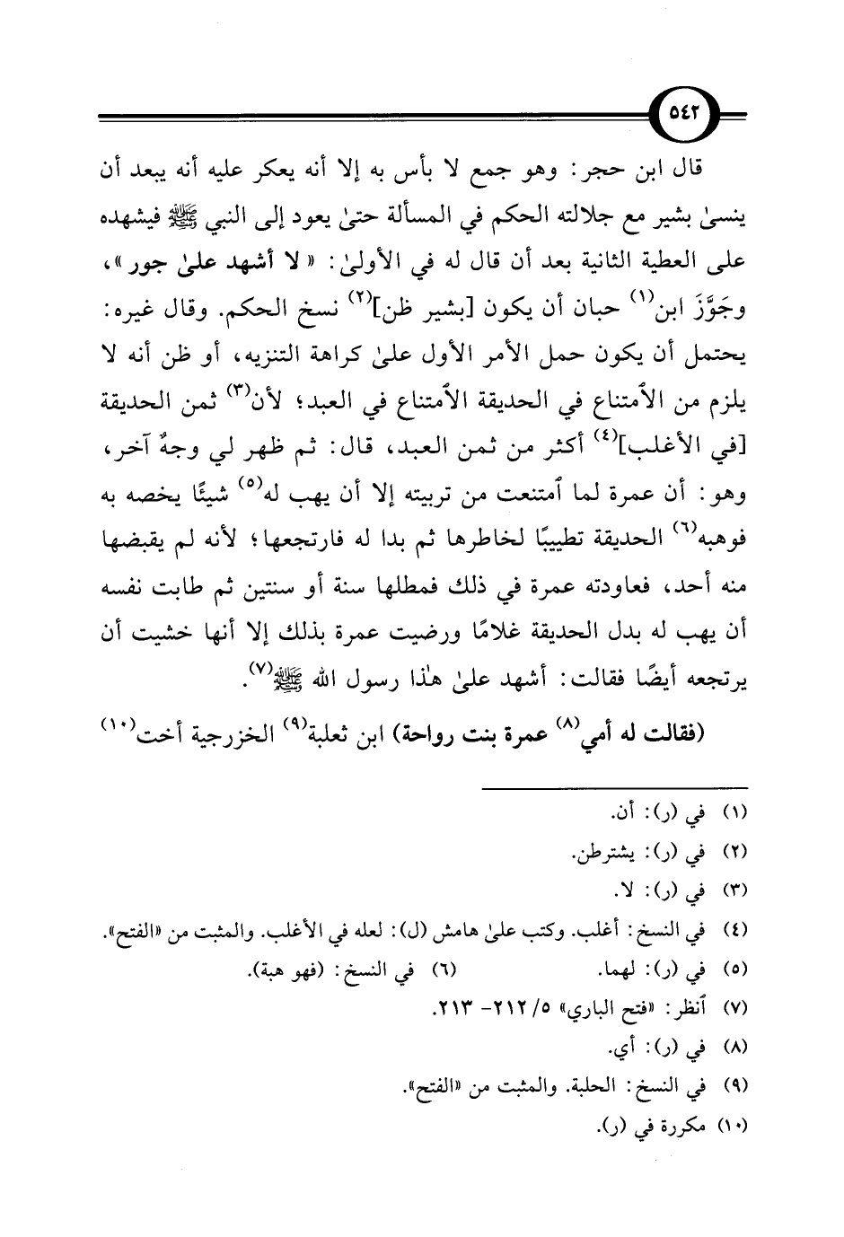 قال ابن حجر: وهو جمع لا بأس به إلا أنه يعكر عليه أنه يبعد أن ينسى بشير مع جلالته الحكم في المسألة حتى يعود إلى النبي - صلى الله عليه وسلم - فيشهده على العطية الثانية بعد أن قال له في الأولى: "لا أشهد على جور"، وجَوَّزَ ابن (¬1) حبان أن يكون [بشير ظن] (¬2) نسخ الحكم. وقال غيره: يحتمل أن يكون حمل الأمر الأول على كراهة التنزيه، أو ظن أنه لا يلزم من الامتناع في الحديقة الامتناع في العبد؛ لأن (¬3) ثمن الحديقة [في الأغلب] (¬4) أكثر من ثمن العبد، قال: ثم ظهر لي وجهٌ آخر، وهو: أن عمرة لما امتنعت من تربيته إلا أن يهب له (¬5) شيئًا يخصه به فوهبه (¬6) الحديقة تطييبًا لخاطرها ثم بدا له فارتجعها؛ لأنه لم يقبضها منه أحد، فعاودته عمرة في ذلك فمطلها سنة أو سنتين ثم طابت نفسه أن يهب له بدل الحديقة غلامًا ورضيت عمرة بذلك إلا أنها خشيت أن يرتجعه أيضًا فقالت: أشهد على هذا رسول الله - صلى الله عليه وسلم - (¬7).