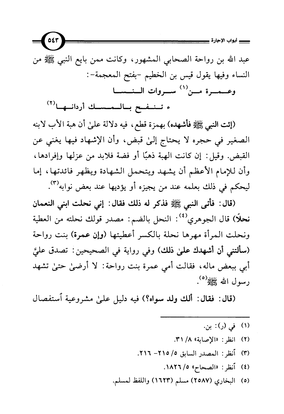 (قال: فأتى النبي - صلى الله عليه وسلم - فذكر له ذلك فقال: إني نحلت ابني النعمان نحلًا) قال الجوهري (¬4): النحل بالضم: مصدر قولك نحلته من العطية ونحلت المرأة مهرها نحلة بالكسر أعطيتها (وإن عمرة) بنت رواحة (سألتني أن أشهدك على ذلك) وفي رواية في الصحيحين: تصدق عليَّ أبي ببعض ماله، فقالت أمي عمرة بنت رواحة: لا أرضى حتى تشهد رسول الله - صلى الله عليه وسلم - (¬5).