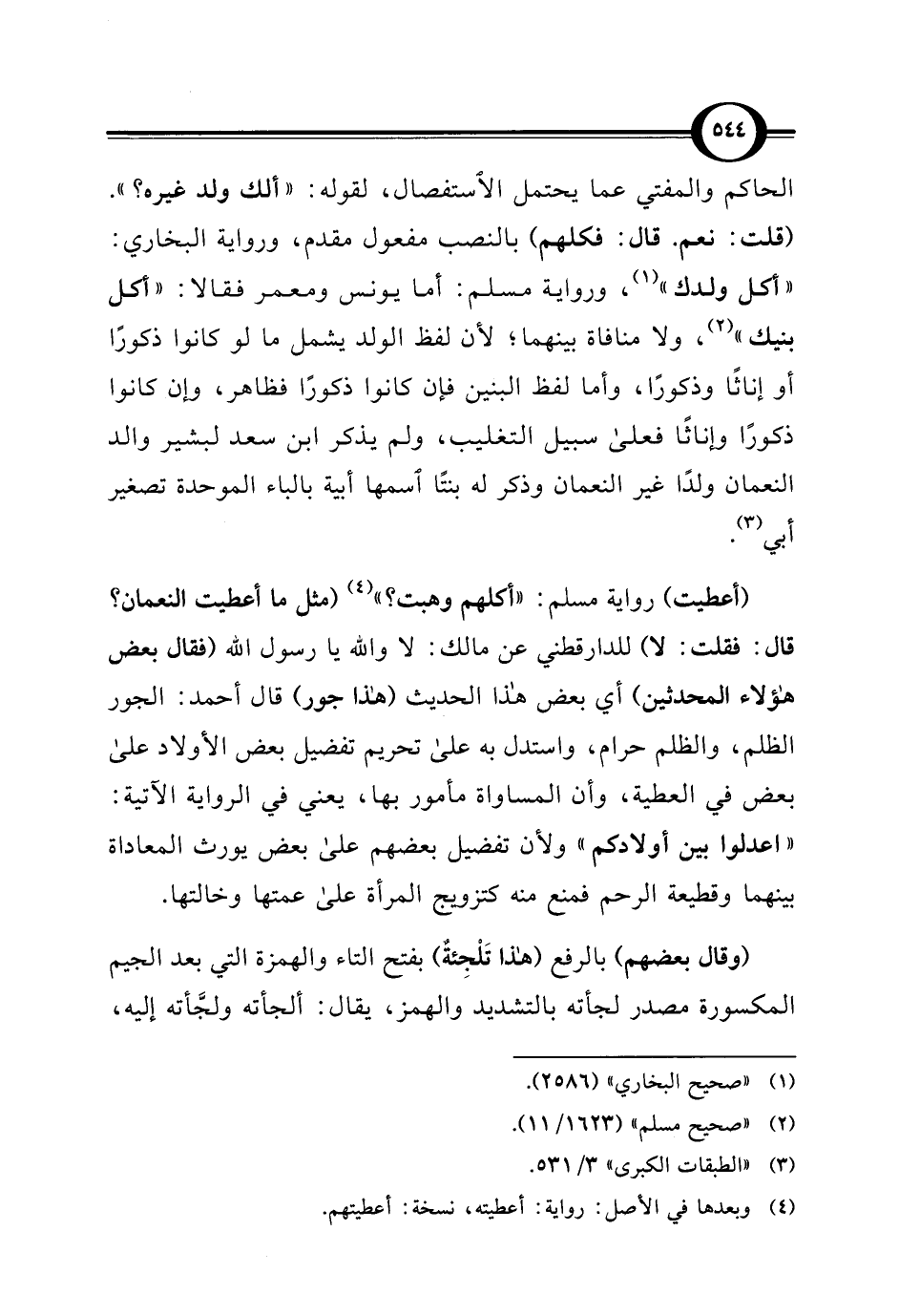 (أعطيت) رواية مسلم: "أكلهم وهبت؟ " (¬4) (مثل ما أعطيت النعمان؟ قال: فقلت: لا) للدارقطني عن مالك: لا والله يا رسول الله (فقال بعض هؤلاء المحدثين) أي بعض هذا الحديث (هذا جور) قال أحمد: الجور الظلم، والظلم حرام، واستدل به على تحريم تفضيل بعض الأولاد على بعض في العطية، وأن المساواة مأمور بها، يعني في الرواية الآتية: "اعدلوا بين أولادكم" ولأن تفضيل بعضهم على بعض يورث المعاداة بينهما وقطيعة الرحم فمنع منه كتزويج المرأة على عمتها وخالتها.