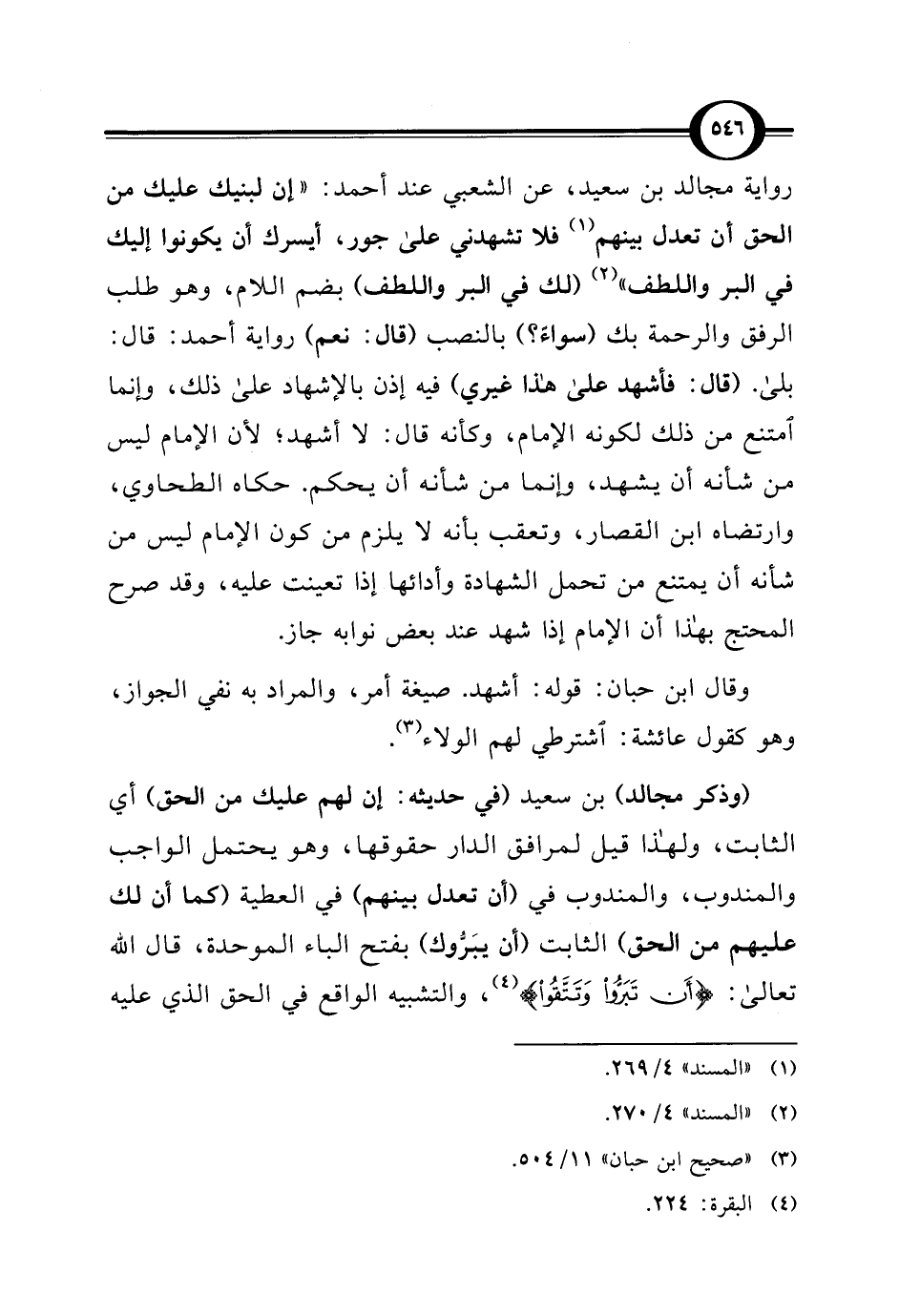 رواية مجالد بن سعيد، عن الشعبي عند أحمد: "إن لبنيك عليك من الحق أن تعدل بينهم (¬1) فلا تشهدني على جور، أيسرك أن يكونوا إليك في البر واللطف" (¬2) (لك في البر واللطف) بضم اللام، وهو طلب الرفق والرحمة بك (سواءً؟ ) بالنصب (قال: نعم) رواية أحمد: قال: بلى. (قال: فأشهد على هذا غيري) فيه إذن بالإشهاد على ذلك، وإنما امتنع من ذلك لكونه الإمام، وكأنه قال: لا أشهد؛ لأن الإمام ليس من شأنه أن يشهد، وإنما من شأنه أن يحكم. حكاه الطحاوي، وارتضاه ابن القصار، وتعقب بأنه لا يلزم من كون الإمام ليس من شأنه أن يمتنع من تحمل الشهادة وأدائها إذا تعينت عليه، وقد صرح المحتج بهذا أن الإمام إذا شهد عند بعض نوابه جاز.