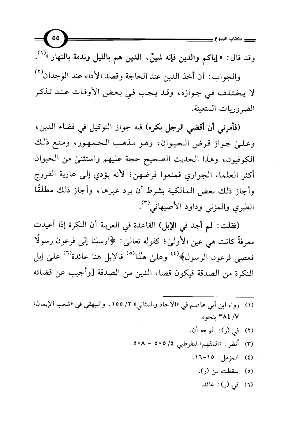 (فقلت: لم أجد في الإبل) القاعدة في العربية أن النكرة إذا أعيدت معرفةً كانت هي عين الأولى؛ كقوله تعالى: {أَرْسَلْنَا إِلَى فِرْعَوْنَ رَسُولًا (15) فَعَصَى فِرْعَوْنُ الرَّسُولَ} (¬4) وعلى هذا (¬5) فالإبل هنا عائدة (¬6) على إبل النكرة من الصدقة فيكون قضاء الدين من الصدقة [وأجيب عن قضائه