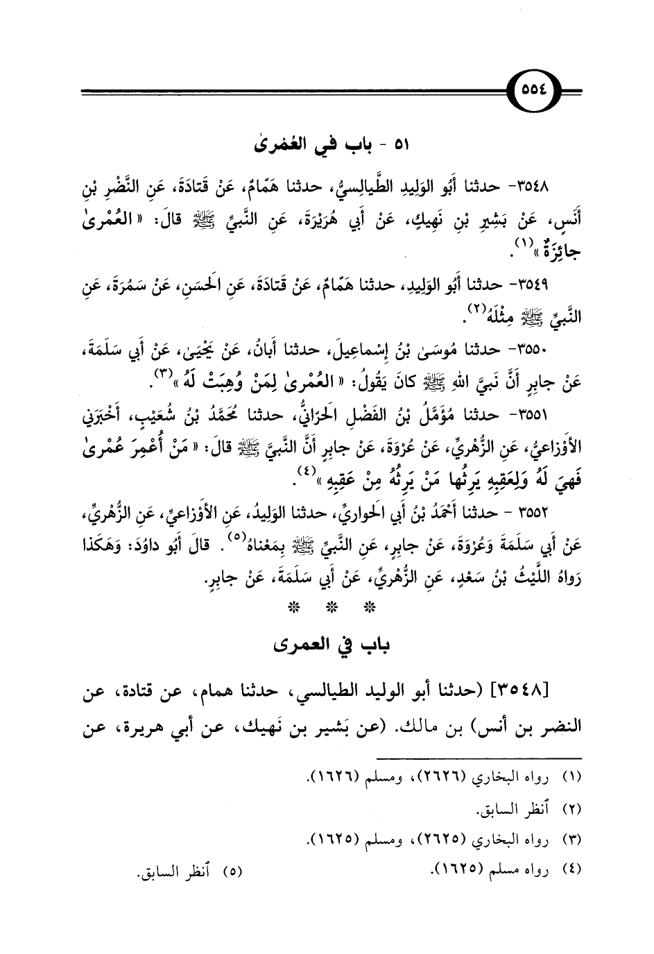 3548 - حدثنا أَبُو الوَلِيدِ الطَّيالِسيُّ، حدثنا هَمّامٌ، عَنْ قَتادَةَ، عَنِ النَّضْرِ بْنِ أَنَسٍ، عَنْ بَشِيرِ بْنِ نَهِيكٍ، عَنْ أَبي هُرَيْرَةَ، عَنِ النَّبيِّ - صلى الله عليه وسلم - قالَ: "العُمْرى جائِزَةٌ" (¬1).