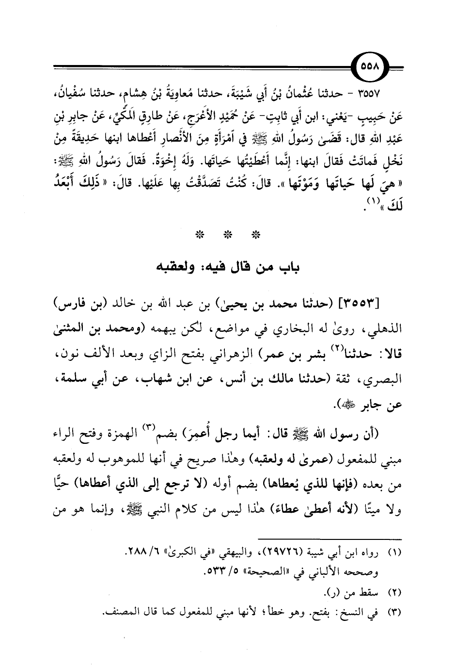 3557 - حدثنا عُثْمانُ بْنُ أَبي شَيْبَةَ، حدثنا مُعاوِيَةُ بْن هِشامٍ، حدثنا سُفْيانُ، عَنْ حَبِيبٍ -يَعْني: ابن أَبي ثابِتٍ- عَنْ حُمَيْدٍ الأَعْرَجِ، عَنْ طارِقٍ الَمكيِّ، عَنْ جابِرِ بْنِ عَبْدِ اللهِ قال: قَضَى رَسُولُ اللهِ - صلى الله عليه وسلم - في امْرَأَةٍ مِنَ الأَنْصارِ أَعْطاها ابنها حَدِيقَةً مِنْ نَخْلٍ فَماتَتْ فَقالَ ابنها: إِنَّما أَعْطَيْتُها حَياتَها. وَلَهُ إِخْوَةٌ. فَقالَ رَسُولُ اللهِ - صلى الله عليه وسلم -: "هيَ لَها حَياتَها وَمَوْتَها". قالَ: كُنْتُ تَصَدَّقْتُ بِها عَلَيْها. قالَ: "ذَلِكَ أَبْعَدُ لَكَ" (¬1).