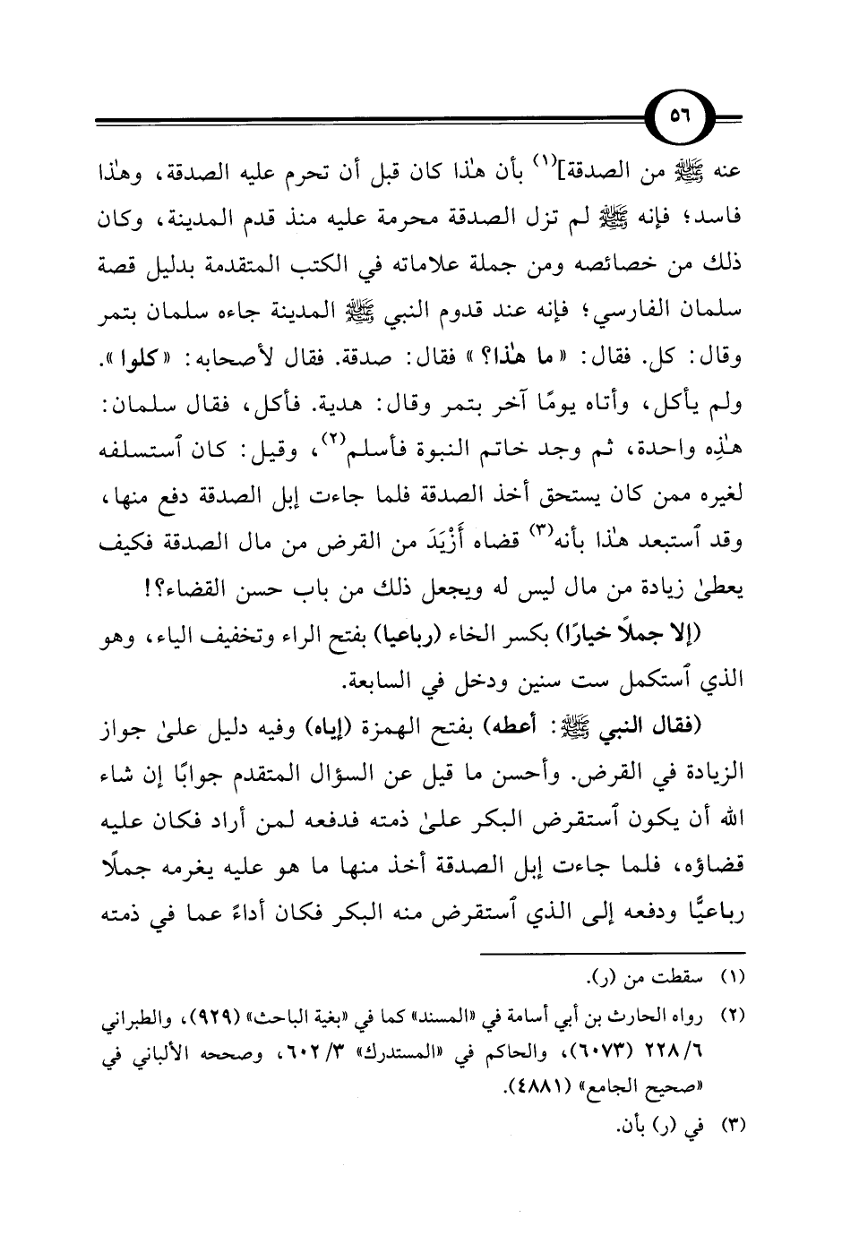 عنه - صلى الله عليه وسلم - من الصدقة] (¬1) بأن هذا كان قبل أن تحرم عليه الصدقة، وهذا فاسد؛ فإنه - صلى الله عليه وسلم - لم تزل الصدقة محرمة عليه منذ قدم المدينة، وكان ذلك من خصائصه ومن جملة علاماته في الكتب المتقدمة بدليل قصة سلمان الفارسي؛ فإنه عند قدوم النبي - صلى الله عليه وسلم - المدينة جاءه سلمان بتمر وقال: كل. فقال: "ما هذا؟ " فقال: صدقة. فقال لأصحابه: "كلوا". ولم يأكل، وأتاه يومًا آخر بتمر وقال: هدية. فأكل، فقال سلمان: هذِه واحدة، ثم وجد خاتم النبوة فأسلم (¬2)، وقيل: كان استسلفه لغيره ممن كان يستحق أخذ الصدقة فلما جاءت إبل الصدقة دفع منها، وقد استبعد هذا بأنه (¬3) قضاه أَزْيَدَ من القرض من مال الصدقة فكيف يعطى زيادة من مال ليس له ويجعل ذلك من باب حسن القضاء؟ !