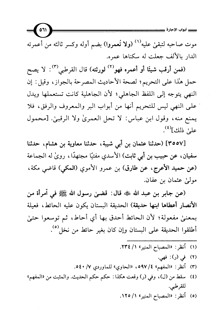 موت صاحبه لتبقى عليه (¬1) (ولا تُعمروا) بضم أوله وكسر ثالثه من أعمرته الدار بالألف جعلت له سكناها عمره.
