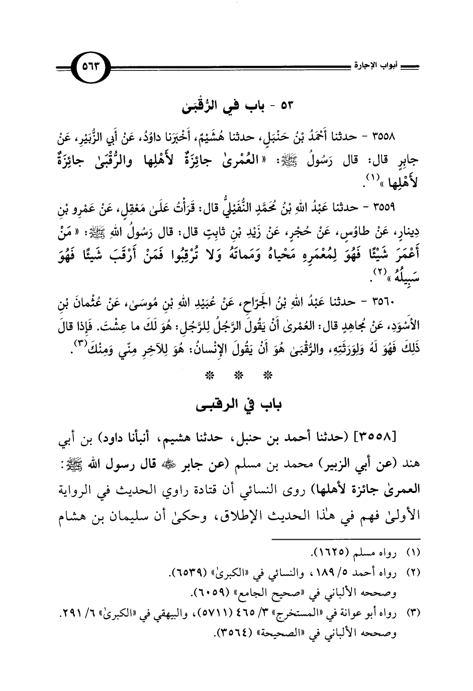 3558 - حدثنا أَحْمَدُ بْنُ حَنْبَلٍ، حدثنا هُشَيْمٌ، أَخْبَرَنا داوُدُ، عَنْ أَبِي الزُّبَيْرِ، عَنْ جابِرٍ قال: قال رَسُولُ - صلى الله عليه وسلم -: "العُمْرى جائِزَةٌ لأَهْلِها والرُّقْبَى جائِزَةٌ لأَهْلِها" (¬1).