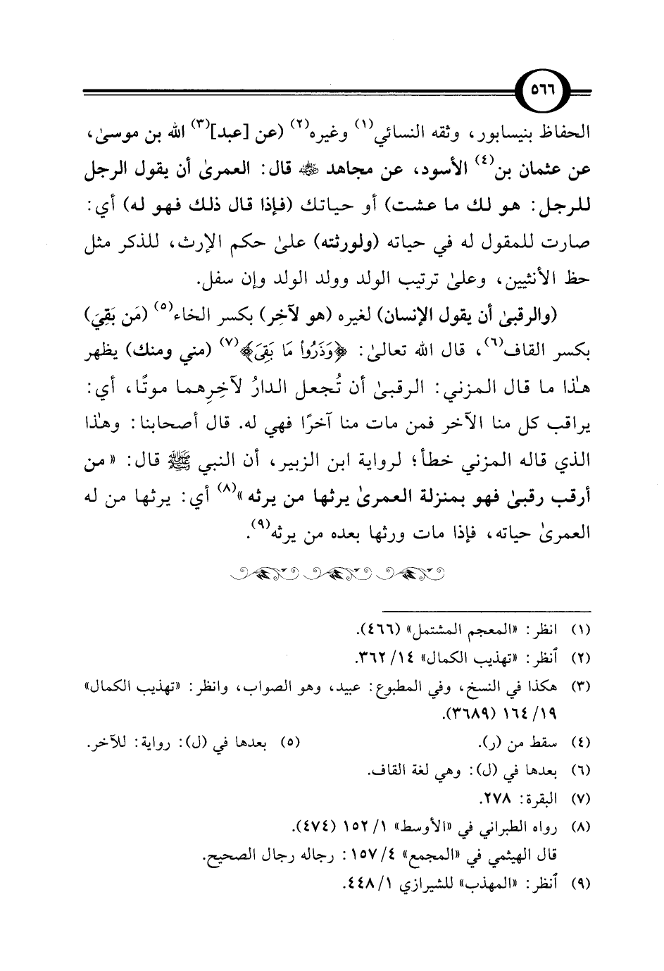 (والرقبى أن يقول الإنسان) لغيره (هو لآخِر) بكسر الخاء (¬5) (مَن بَقِيَ) بكسر القاف (¬6)، قال الله تعالى: {وَذَرُوا مَا بَقِيَ} (¬7) (مني ومنك) يظهر هذا ما قال المزني: الرقبى أن تُجعل الدارُ لآخِرِهما موتًا، أي: يراقب كل منا الآخر فمن مات منا آخرًا فهي له. قال أصحابنا: وهذا الذي قاله المزني خطأ؛ لرواية ابن الزبير، أن النبي - صلى الله عليه وسلم - قال: "من أرقب رقبى فهو بمنزلة العمرى يرثها من يرثه" (¬8) أي: يرثها من له العمرى حياته، فإذا مات ورثها بعده من يرثه (¬9).