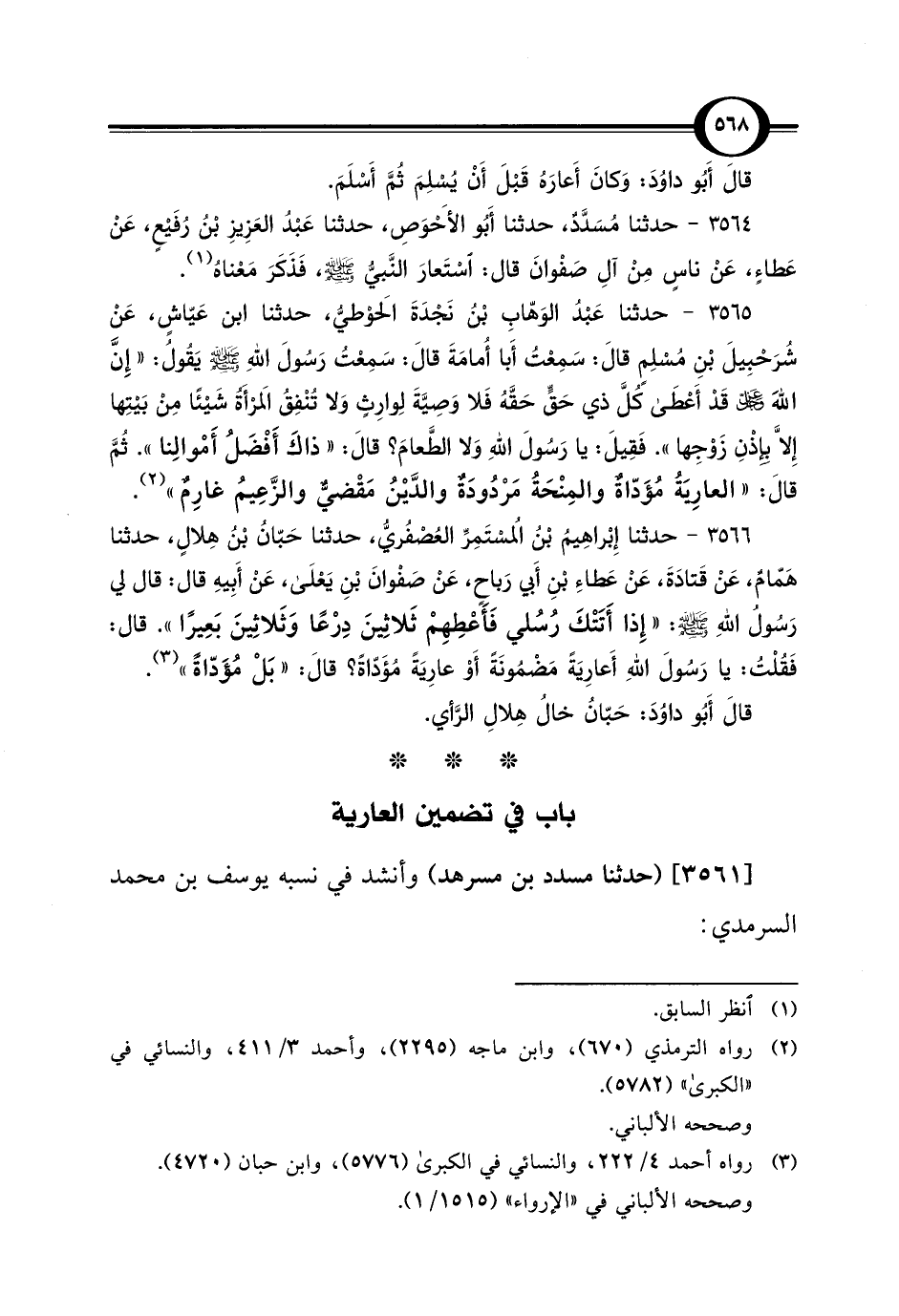 3566 - حدثنا إِبْراهِيمُ بْنُ المُسْتَمِرِّ العُصْفُريُّ، حدثنا حَبّانُ بْن هِلالٍ، حدثنا هَمّامٌ، عَنْ قَتادَةَ، عَنْ طَاءِ بْنِ أَبي رَباحٍ، عَنْ صَفْوانَ بْنِ يَعْلَى، عَنْ أَبِيهِ قال: قال لي رَسُول اللهِ - صلى الله عليه وسلم -: "إِذا أَتَتْكَ رُسُلي فَأَعْطِهِمْ ثَلاثِينَ دِرْعًا وَثَلاثِينَ بَعِيرًا". قال: فَقلْتُ: يا رَسُولَ اللهِ أَعارِيَةً مَضْمُونَةً أَوْ عارِيَةً مُؤَدّاةً؟ قالَ: "بَلْ مُؤَدّاةً" (¬3).
