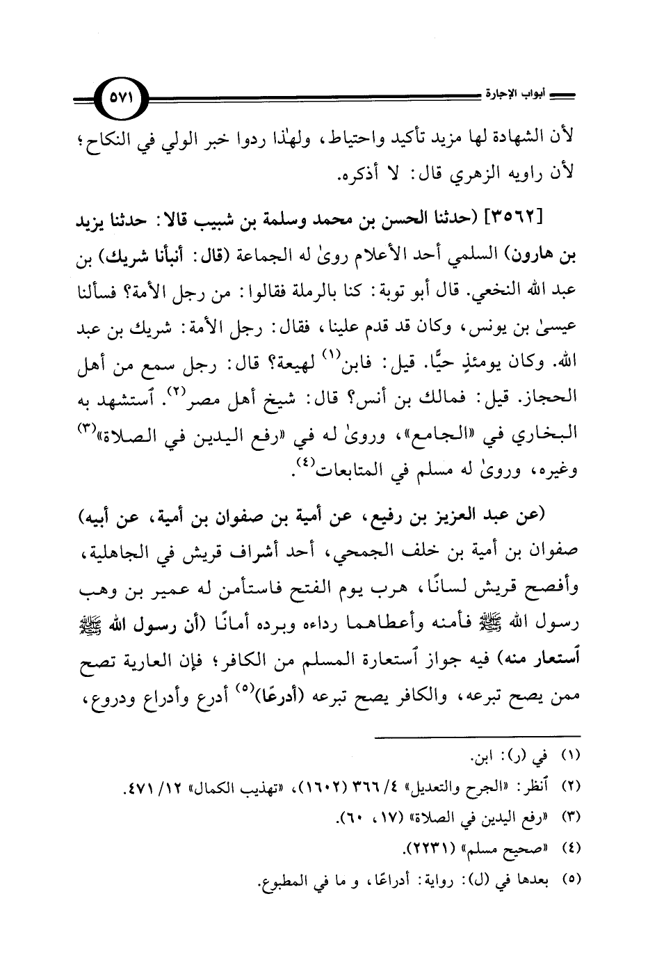 [3562] (حدثنا الحسن بن محمد وسلمة بن شبيب قالا: حدثنا يزيد بن هارون) السلمي أحد الأعلام روى له الجماعة (قال: أنبأنا شريك) بن عبد الله النخعي. قال أبو توبة: كنا بالرملة فقالوا: من رجل الأمة؟ فسألنا عيسى بن يونس، وكان قد قدم علينا، فقال: رجل الأمة: شريك بن عبد الله. وكان يومئذٍ حيًّا. قيل: فابن (¬1) لهيعة؟ قال: رجل سمع من أهل الحجاز. قيل: فمالك بن أنس؟ قال: شيخ أهل مصر (¬2). استشهد به البخاري في "الجامع"، وروى له في "رفع اليدين في الصلاة" (¬3) وغيره، وروى له مسلم في المتابعات (¬4).