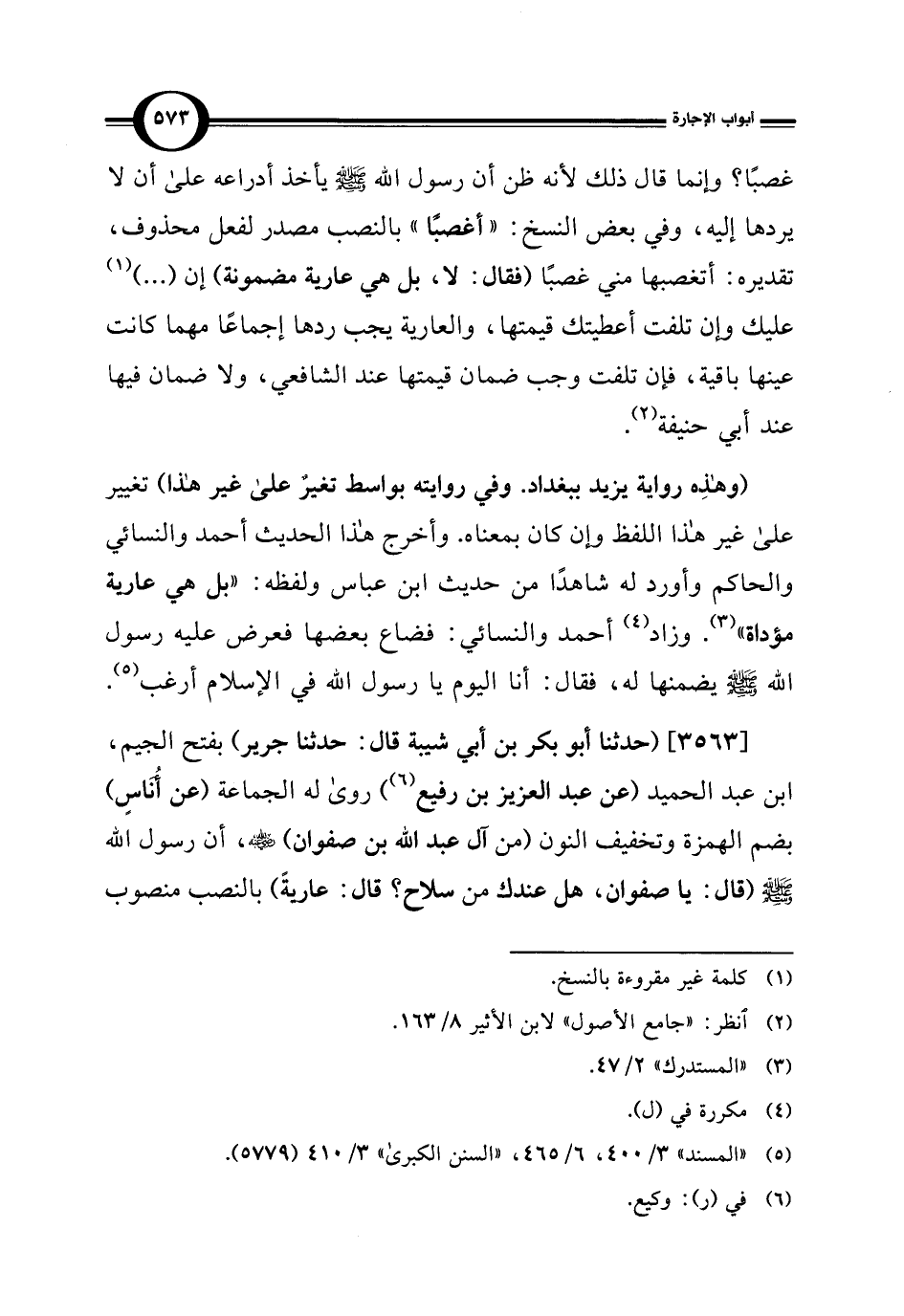 [3563] (حدثنا أبو بكر بن أبي شيبة قال: حدثنا جرير) بفتح الجيم، ابن عبد الحميد (عن عبد العزيز بن رفيع) (¬6) روى له الجماعة (عن أُنَاسٍ) بضم الهمزة وتخفيف النون (من آل عبد الله بن صفوان) -رضي الله عنه-، أن رسول الله - صلى الله عليه وسلم - (قال: يا صفوان، هل عندك من سلاح؟ قال: عاريةً) بالنصب منصوب