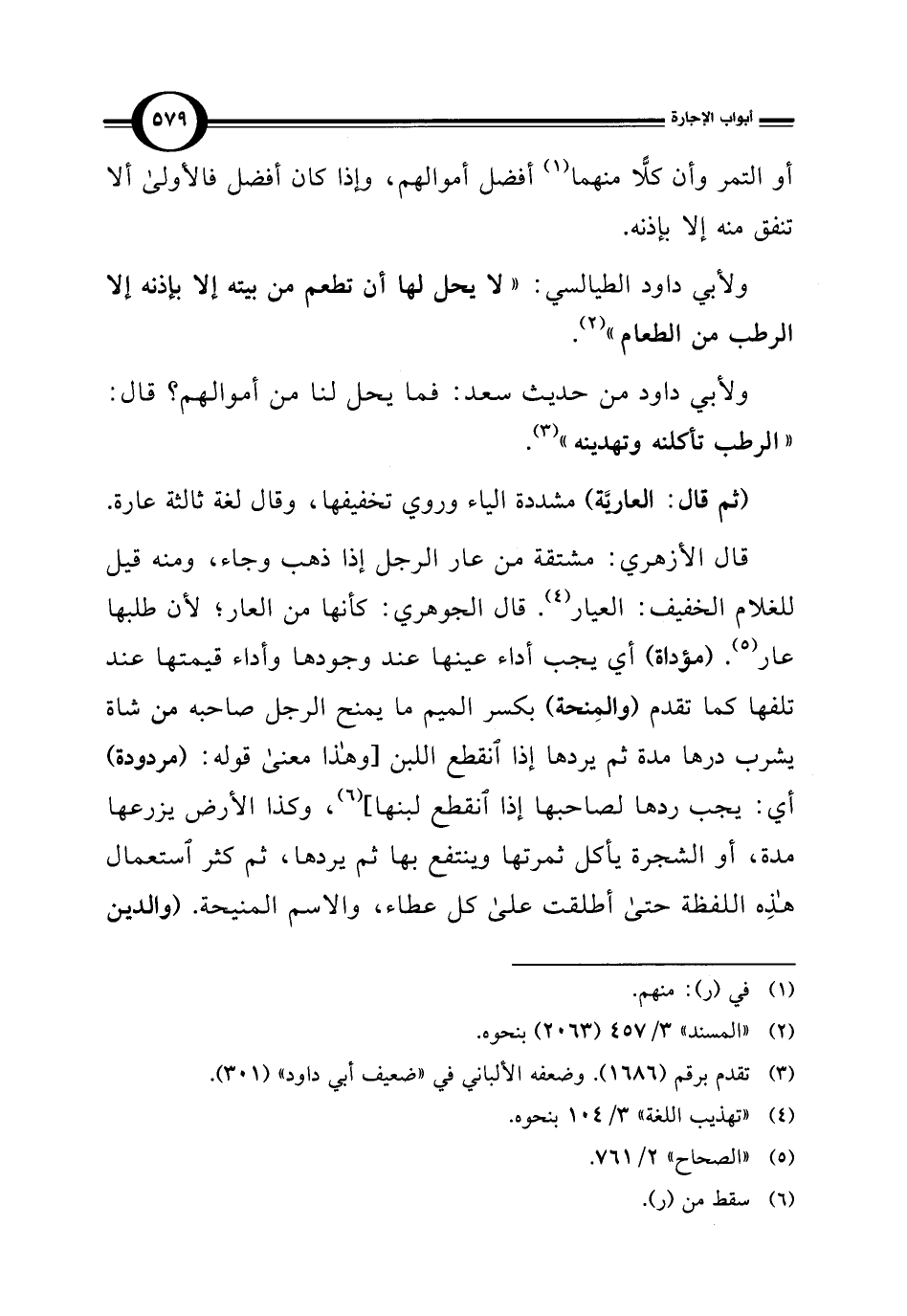 (ثم قال: العاريَّة) مشددة الياء وروي تخفيفها، وقال لغة ثالثة عارة. قال الأزهري: مشتقة من عار الرجل إذا ذهب وجاء، ومنه قيل للغلام الخفيف: العيار (¬4). قال الجوهري: كأنها من العار؛ لأن طلبها عار (¬5). (مؤداة) أي يجب أداء عينها عند وجودها وأداء قيمتها عند تلفها كما تقدم (والمِنحة) بكسر الميم ما يمنح الرجل صاحبه من شاة يشرب درها مدة ثم يردها إذا انقطع اللبن [وهذا معنى قوله: (مردودة) أي: يجب ردها لصاحبها إذا انقطع لبنها] (¬6)، وكذا الأرض يزرعها مدة، أو الشجرة يأكل ثمرتها وينتفع بها ثم يردها، ثم كثر استعمال هذِه اللفظة حتى أطلقت على كل عطاء، والاسم المنيحة. (والدين