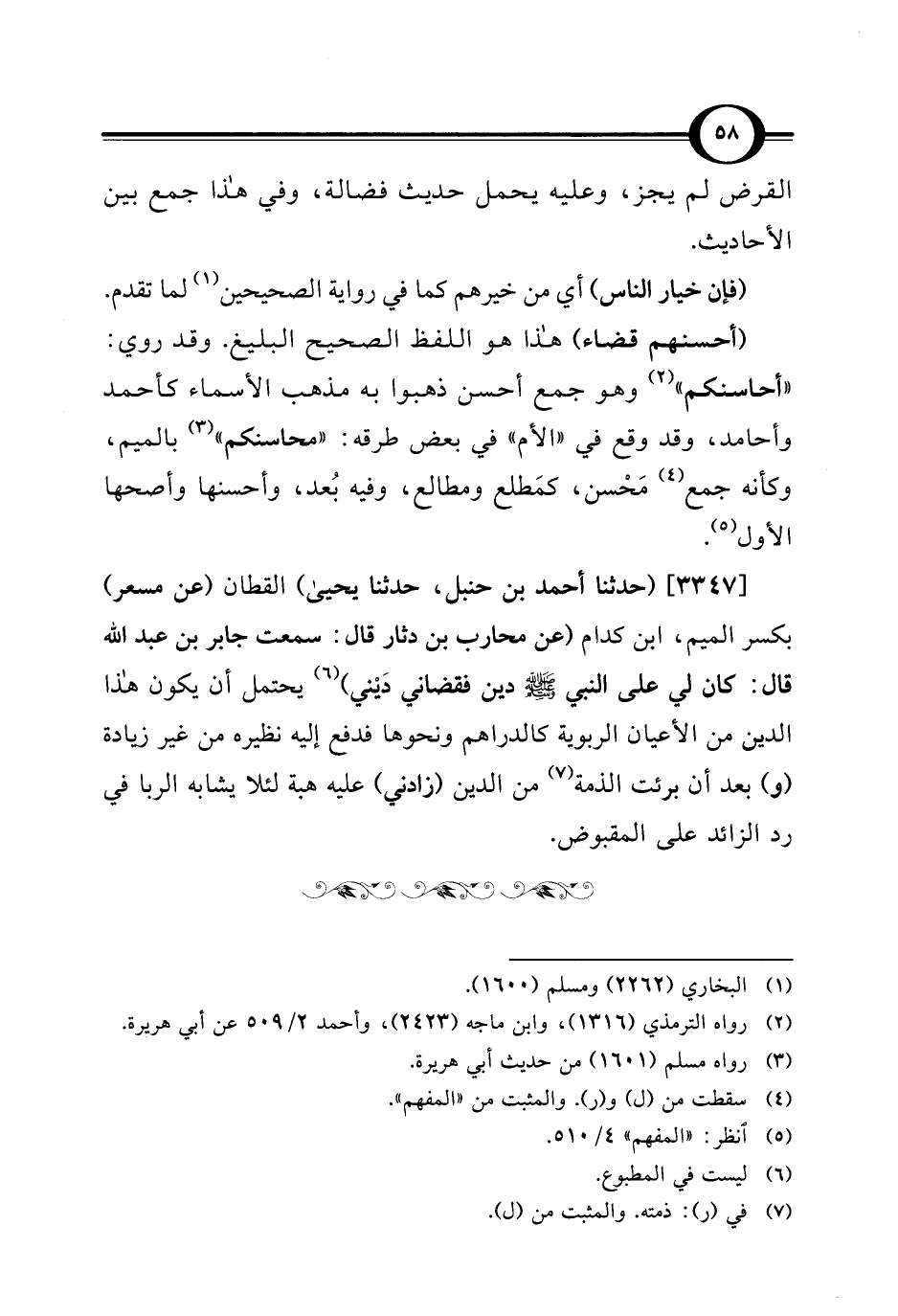 [3347] (حدثنا أحمد بن حنبل، حدثنا يحيى) القطان (عن مسعر) بكسر الميم، ابن كدام (عن محارب بن دثار قال: سمعت جابر بن عبد الله قال: كان لي على النبي - صلى الله عليه وسلم - دين فقضاني دَيْني) (¬6) يحتمل أن يكون هذا الدين من الأعيان الربوية كالدراهم ونحوها فدفع إليه نظيره من غير زيادة (و) بعد أن برئت الذمة (¬7) من الدين (زادني) عليه هبة لئلا يشابه الربا في رد الزائد على المقبوض.