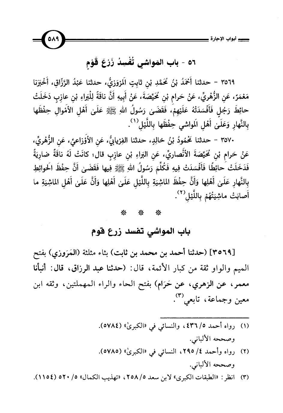 [3569] (حدثنا أحمد بن محمد بن ثابت) بثاء مثلثة (المَرَوزي) بفتح الميم والواو ثقة من كبار الأئمة، قال: (حدثنا عبد الرزاق، قال: أنبأنا معمر، عن الزهري، عن حَرَام) بفتح الحاء والراء المهملتين، وثقه ابن معين وجماعة، تابعي (¬3).