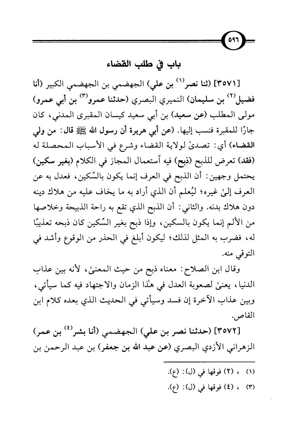 [3571] (ثنا نصر (¬1) بن علي) الجهضمي بن الجهضمي الكبير (أنا فضيل (¬2) بن سليمان) النميري البصري (حدثنا عمرو (¬3) بن أبي عمرو) مولى المطلب (عن سعيد) بن أبي سعيد كيسان المقبرى المدني، كان جارًا للمقبرة فنسب إليها. (عن أبي هريرة أن رسول الله - صلى الله عليه وسلم - قال: من ولي القضاء) أي: تصدى لولاية القضاء وشرع في الأسباب المحصلة له (فقد) تعرض للذبح (ذبح) فيه استعمال المجاز في الكلام (بغير سكين) يحتمل وجهين: أن الذبح في العرف إنما يكون بالسِّكين، فعدل به عن العرف إلى غيره؛ ليُعلم أن الذي أراد به ما يخاف عليه من هلاك دينه دون هلاك بدنه. والثاني: أن الذبح الذي تقع به راحة الذبيحة وخلاصها من الألم إنما يكون بالسكين، وإذا ذبح بغير السِّكين كان ذبحه تعذيبًا له، فضرب به المثل لذلك؛ ليكون أبلغ في الحذر من الوقوع وأشد في التوقي منه.