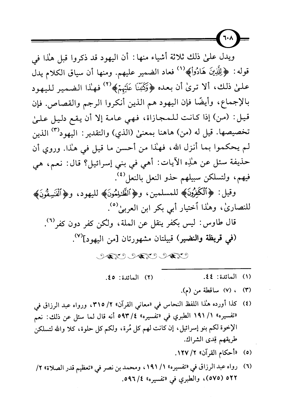 ويدل على ذلك ثلاثة أشياء منها: أن اليهود قد ذكروا قبل هذا في قوله: {لِلَّذِينَ هَادُوا} (¬1) فعاد الضمير عليهم. ومنها أن سياق الكلام يدل على ذلك، ألا ترى أن بعده {وَكَتَبْنَا عَلَيْهِمْ} (¬2) فهذا الضمير لليهود بالإجماع، وأيضًا فإن اليهود هم الذين أنكروا الرجم والقصاص. فإن قيل: (من) إذا كانت للمجازاة، فهي عامة إلا أن يقع دليل على تخصيصها. قيل له (من) هاهنا بمعنى (الذي) والتقدير: اليهود (¬3) الذين لم يحكموا بما أنزل الله، فهذا من أحسن ما قيل في هذا. وروي أن حذيفة سئل عن هذِه الآيات: أهي في بني إسرائيل؟ قال: نعم، هي فيهم، ولتسلكن سبيلهم حذو النعل بالنعل (¬4).