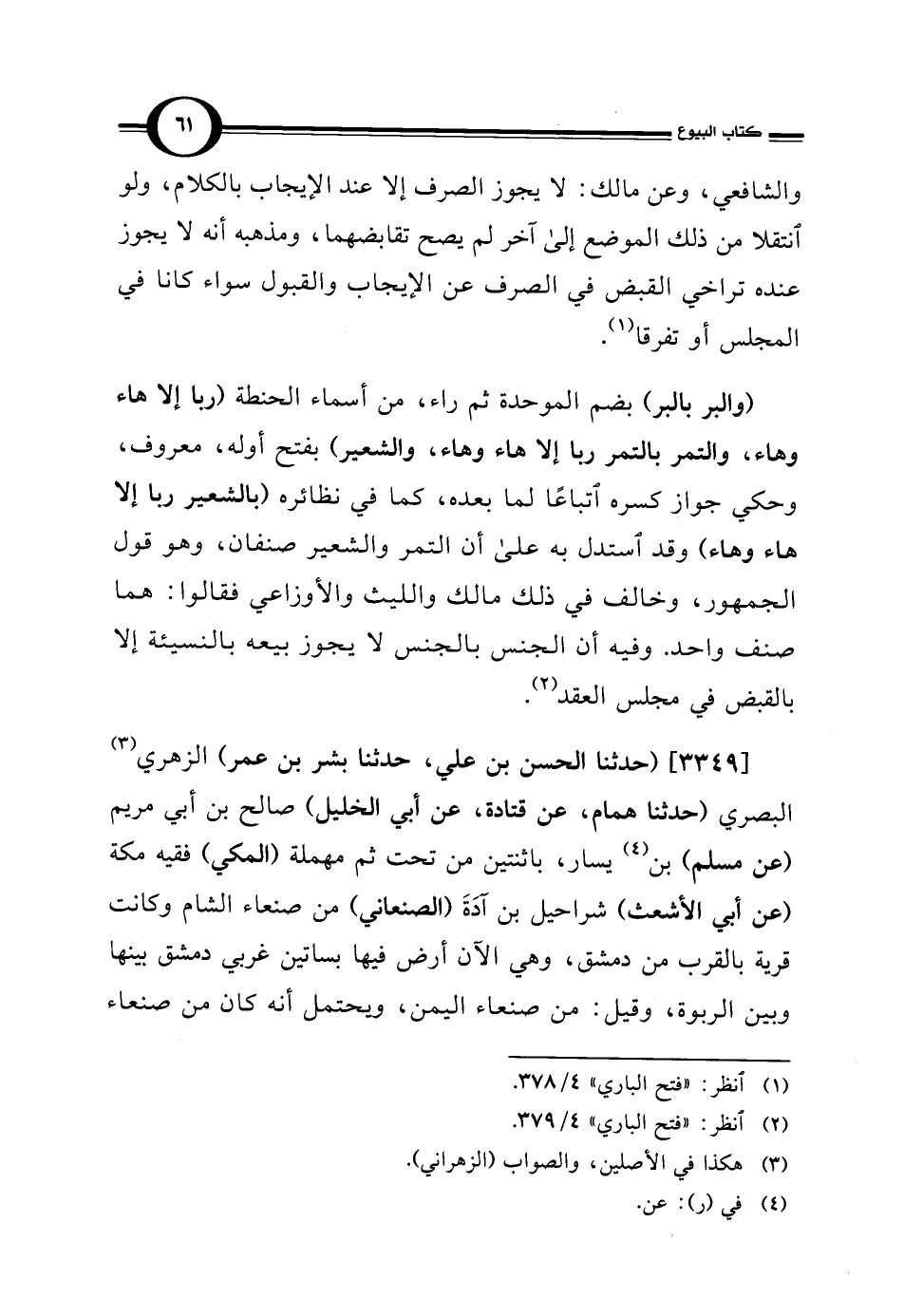 [3349] (حدثنا الحسن بن علي، حدثنا بشر بن عمر) الزهري (¬3) البصري (حدثنا همام، عن قتادة، عن أبي الخليل) صالح بن أبي مريم (عن مسلم) بن (¬4) يسار، باثنتين من تحت ثم مهملة (المكي) فقيه مكة (عن أبي الأشعث) شراحيل بن آدَةَ (الصنعاني) من صنعاء الشام وكانت قرية بالقرب من دمشق، وهي الآن أرض فيها بساتين غربي دمشق بينها وبين الربوة، وقيل: من صنعاء اليمن، ويحتمل أنه كان من صنعاء