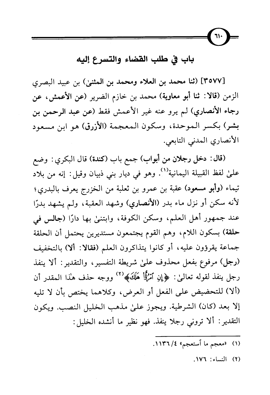 [3577] (ثنا محمد بن العلاء ومحمد بن المثنى) بن عبيد البصري الزمن (قالا: ثنا أبو معاوية) محمد بن خازم الضرير (عن الأعمش، عن رجاء الأنصاري) لم يرو عنه غير الأعمش فقط (عن عبد الرحمن بن بشر) بكسر الموحدة، وسكون المعجمة (الأزرق) هو ابن مسعود الأنصاري المدني التابعي.