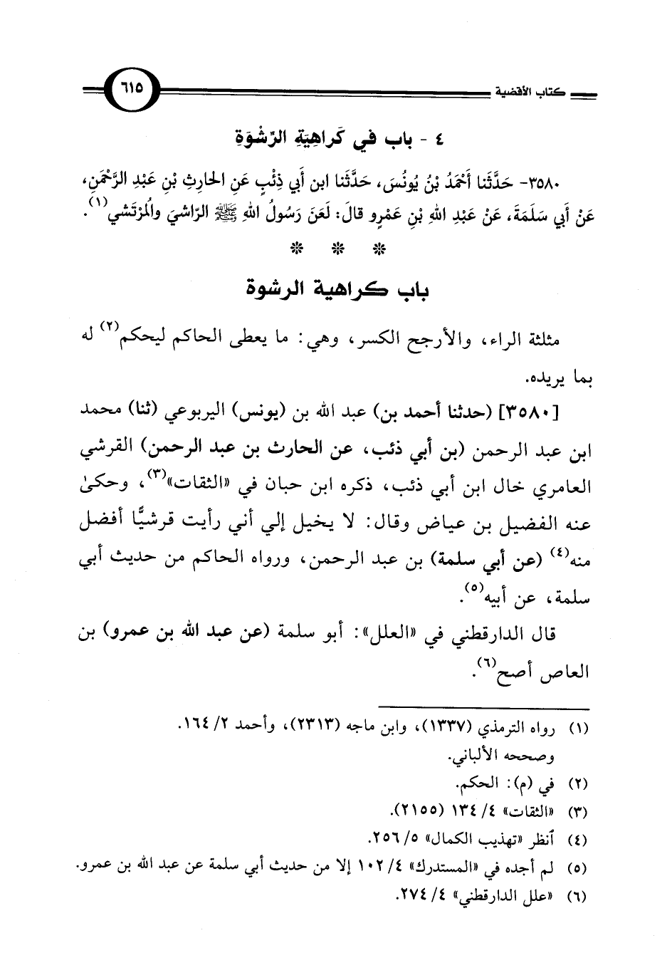 3580 - حَدَّثَنا أَحْمَدُ بْنُ يُونُسَ، حَدَّثَنا ابن أَبي ذِئْبٍ عَنِ الحارِثِ بْنِ عَبْدِ الرَّحْمَنِ، عَنْ أَبي سَلَمَةَ، عَنْ عَبْدِ اللهِ بْنِ عَمْرٍو قالَ: لَعَنَ رَسُولُ اللهِ - صلى الله عليه وسلم - الرّاشيَ والمُرْتَشي (¬1).
