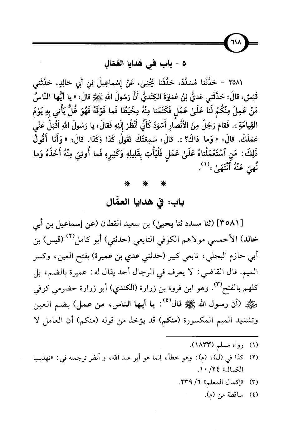 [3581] (ثنا مسدد ثنا يحيى) بن سعيد القطان (عن إسماعيل بن أبي خالد) الأحمسي مولاهم الكوفي التابعي (حدثني) أبو كامل (¬2) (قيس) بن أبي حازم البجلي، تابعي كبير (حدثني عدي بن عميرة) بفتح العين، وكسر الميم. قال القاضي: لا يعرف في الرجال أحد يقال له: عميرة بالضم، بل كلهم بالفتح (¬3). وهو ابن فروة بن زرارة (الكندي) أبو زرارة حضرمي كوفي -رضي الله عنه- (أن رسول الله - صلى الله عليه وسلم - قال (¬4): يا أيها الناس، من عمل) بضم العين وتشديد الميم المكسورة (منكم) قد يؤخذ من قوله (منكم) أن العامل لا