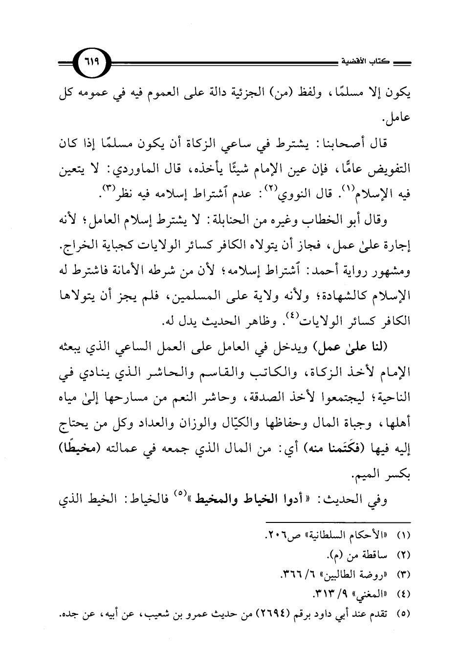 وقال أبو الخطاب وغيره من الحنابلة: لا يشترط إسلام العامل؛ لأنه إجارة على عمل، فجاز أن يتولاه الكافر كسائر الولايات كجباية الخراج. ومشهور رواية أحمد: اشتراط إسلامه؛ لأن من شرطه الأمانة فاشترط له الإسلام كالشهادة؛ ولأنه ولاية على المسلمين، فلم يجز أن يتولاها الكافر كسائر الولايات (¬4). وظاهر الحديث يدل له.