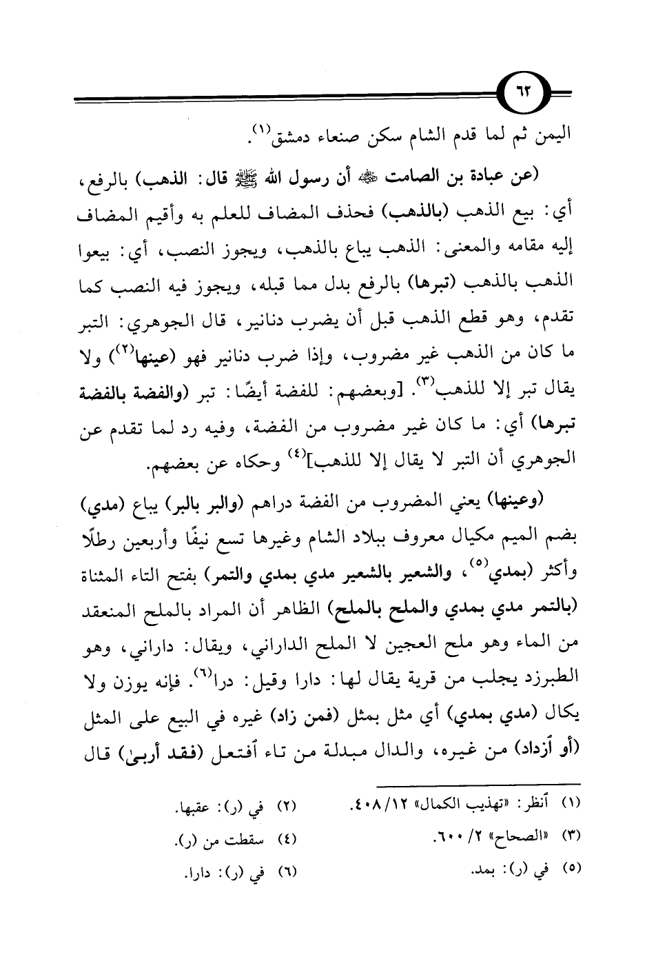 (عن عبادة بن الصامت -رضي الله عنه- أن رسول الله - صلى الله عليه وسلم - قال: الذهب) بالرفع، أي: بيع الذهب (بالذهب) فحذف المضاف للعلم به وأقيم المضاف إليه مقامه والمعنى: الذهب يباع بالذهب، ويجوز النصب، أي: بيعوا الذهب بالذهب (تبرها) بالرفع بدل مما قبله، ويجوز فيه النصب كما تقدم، وهو قطع الذهب قبل أن يضرب دنانير، قال الجوهري: التبر ما كان من الذهب غير مضروب، وإذا ضرب دنانير فهو (عينها) (¬2) ولا يقال تبر إلا للذهب (¬3). [وبعضهم: للفضة أيضًا: تبر (والفضة بالفضة تبرها) أي: ما كان غير مضروب من الفضة، وفيه رد لما تقدم عن الجوهري أن التبر لا يقال إلا للذهب] (¬4) وحكاه عن بعضهم.