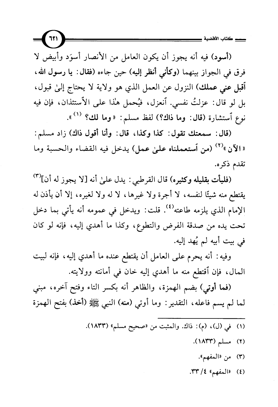 (فليأت بقليله وكثيره) قال القرطبي: يدل على أنه [لا يجوز له أن] (¬3) يقتطع منه شيئًا لنفسه، لا أجرة ولا غيرها، لا له ولا لغيره، إلا أن يأذن له الإمام الذي يلزمه طاعته (¬4). قلت: ويدخل في عمومه أنه يأتي بما دخل تحت يده من صدقة الفرض والتطوع، وكذا ما أهدي إليه، فإنه لو كان في بيت أبيه لم يُهد إليه.