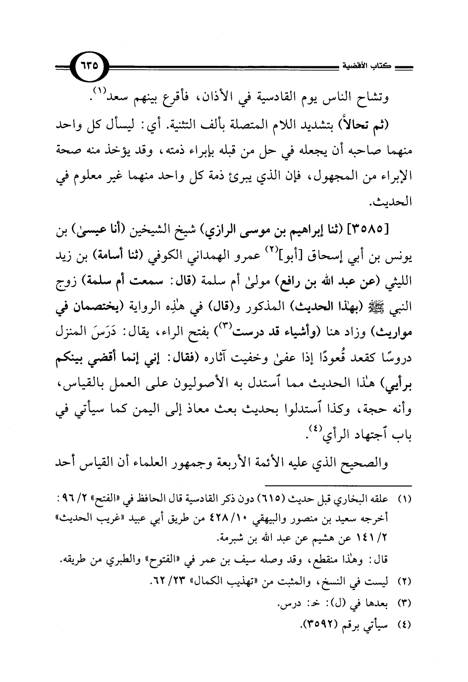 [3585] (ثنا إبراهيم بن موسى الرازي) شيخ الشيخين (أنا عيسى) بن يونس بن أبي إسحاق [أبو] (¬2) عمرو الهمداني الكوفيِّ (ثنا أسامة) بن زيد الليثي (عن عبد الله بن رافع) مولى أم سلمة (قال: سمعت أم سلمة) زوج النبي - صلى الله عليه وسلم - (بهذا الحديث) المذكور و (قال) في هذِه الرِّواية (يختصمان في مواريث) وزاد هنا (وأشياء قد درست) (¬3) بفتح الراء، يقال: دَرَسَ المنزل دروسًا كقعد قُعودًا إذا عفى وخفيت آثاره (فقال: إني إنما أقضي بينكم برأيي) هذا الحديث مما استدل به الأصوليون على العمل بالقياس، وأنَّه حجة، وكذا استدلوا بحديث بعث معاذ إلى اليمن كما سيأتي في باب اجتهاد الرأي (¬4).