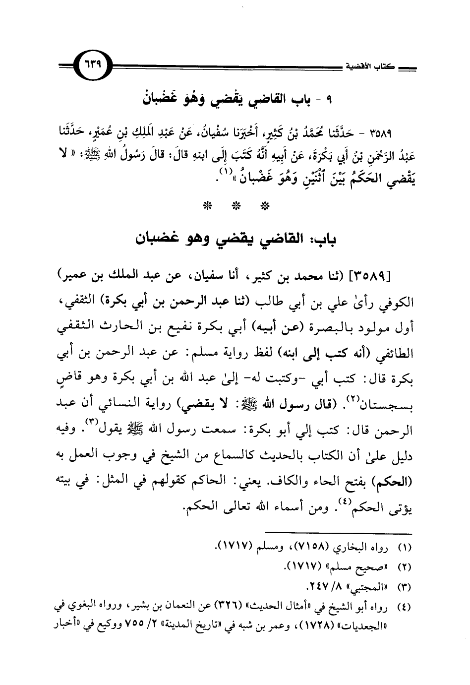 [3589] (ثنا محمد بن كثير، أنا سفيان، عن عبد الملك بن عمير) الكوفيِّ رأى علي بن أبي طالب (ثنا عبد الرحمن بن أبي بكرة) الثَّقفيُّ، أول مولود بالبصرة (عن أبيه) أبي بكرة نفيع بن الحارث الثَّقفيُّ الطائفي (أنه كتب إلى ابنه) لفظ رواية مسلم: عن عبد الرحمن بن أبي بكرة قال: كتب أبي- وكتبت له- إلى عبد الله بن أبي بكرة وهو قاضٍ بسجستان (¬2). (قال رسول الله - صلى الله عليه وسلم -: لا يقضي) رواية النسائي أن عبد الرحمن قال: كتب إلى أبو بكرة: سمعت رسول الله - صلى الله عليه وسلم - يقول (¬3). وفيه دليل على أن الكتاب بالحديث كالسماع من الشيخ في وجوب العمل به (الحكم) بفتح الحاء والكاف. يعني: الحاكم كقولهم في المثل: في بيته يؤتى الحكم (¬4). ومن أسماء الله تعالى الحكم.