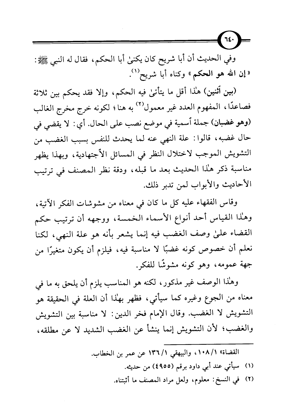 وهذا الوصف غير مذكور، لكنَّه هو المناسب يلزم أن يلحق به ما في معناه من الجوع وغيره كما سيأتي، فظهر بهذا أن العلة في الحقيقة هو التشويش لا الغضب. وقال الإمام فخر الدين: لا مناسبة بين التشويش والغضب؛ لأن التشويش إنما ينشأ عن الغضب الشديد لا عن مطلقه،