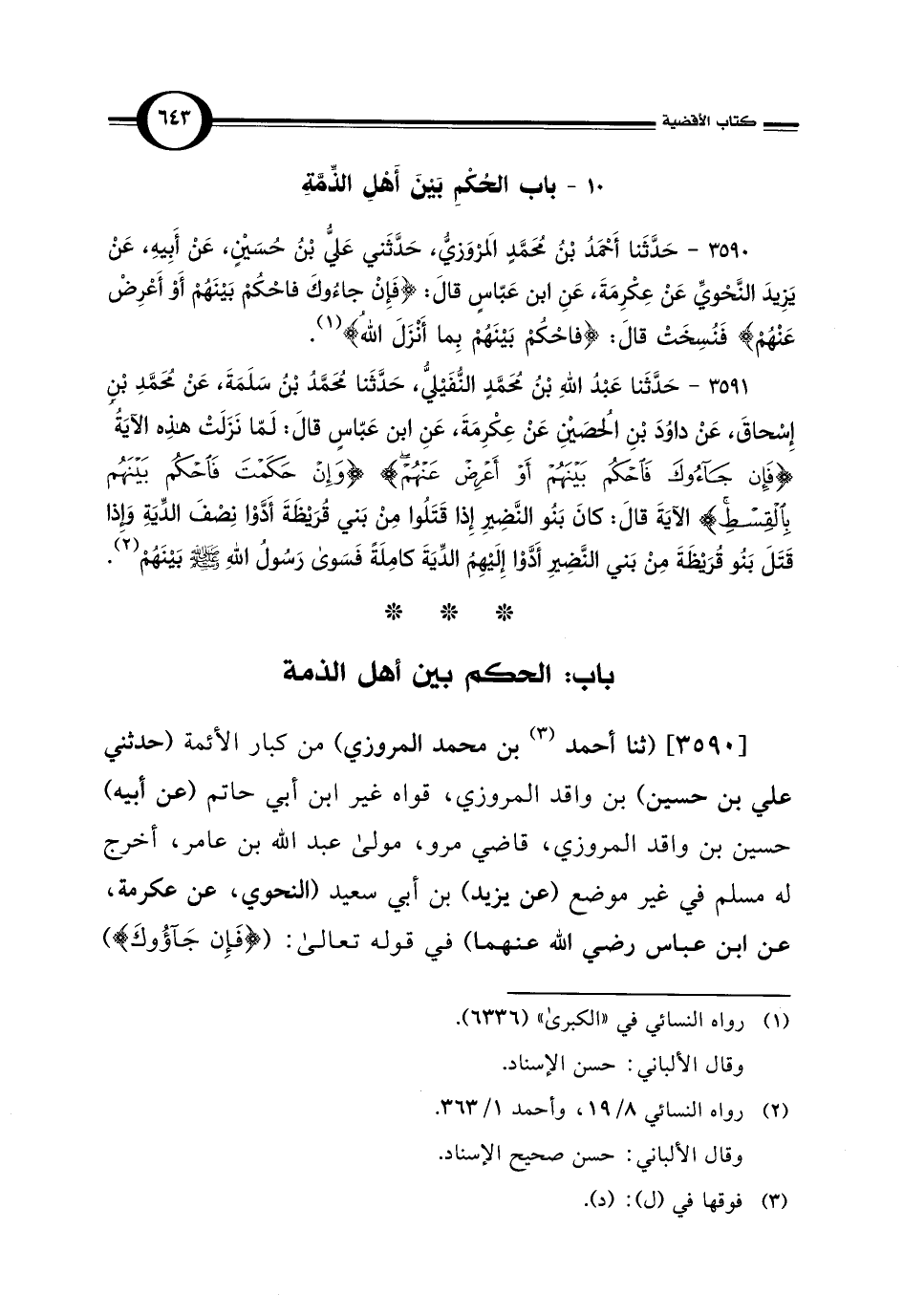 [3590] (ثنا أحمد (¬3) بن محمد المروزي) من كبار الأئمة (حدثني علي بن حسين) بن واقد المروزي، قواه غير ابن أبي حاتم (عن أبيه) حسين بن واقد المروزي، قاضي مرو، مولى عبد الله بن عامر، أخرج له مسلم في غير موضع (عن يزيد) بن أبي سعيد (النحوي، عن عكرمة، عن ابن عباس رضي الله عنهما) في قوله تعالى: {فَإِنْ جَاءُوكَ})