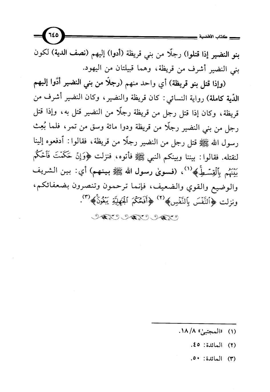 (وإذا قتل بنو قريظة) أي واحد منهم (رجلًا من بني النضير أدَّوا إليهم الدِّية كاملة) رواية النسائي: كان قريظة والنضير، وكان النضير أشرف من قريظة، وكان إذا قتل رجل من قريظة رجلًا من النضير قتل به، وإذا قتل رجل من بني النضير رجلًا من قريظة ودوا مائة وسق من تمر، فلما بُعِث رسول الله - صلى الله عليه وسلم - قتل رجل من النضير رجلًا من قريظة، فقالوا: ادفعوه إلينا لنقتله. فقالوا: بيننا وبينكم النبي - صلى الله عليه وسلم - فأتوه، فنزلت {وَإِنْ حَكَمْتَ فَاحْكُمْ بَيْنَهُمْ بِالْقِسْطِ} (¬1)، (فسوى رسول الله - صلى الله عليه وسلم - بينهم) أي: بين الشريف والوضيع والقوي والضعيف، فإنَّما ترحمون وتنصرون بضعفائكم، ونزلت {النَّفْسَ بِالنَّفْسِ} (¬2) {أَفَحُكْمَ الْجَاهِلِيَّةِ يَبْغُونَ} (¬3).