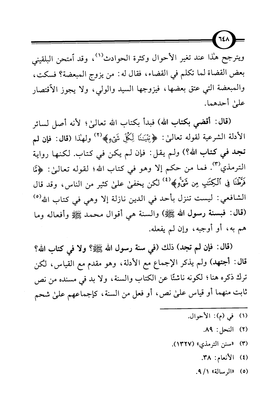 (قال: أقضي بكتاب الله) فبدأ بكتاب الله تعالى؛ لأنه أصل لسائر الأدلة الشرعية لقوله تعالى: {تِبْيَانًا لِكُلِّ شَيْءٍ} (¬2) ولهذا (قال: فإن لم تجد في كتاب الله؟ ) ولم يقل: فإن لم يكن في كتاب. لكنها رواية الترمذي (¬3). فما من حكم إلا وهو في كتاب الله؛ لقوله تعالى: {مَا فَرَّطْنَا فِي الْكِتَابِ مِنْ شَيْءٍ} (¬4) لكن يخفى على كثير من الناس، وقد قال الشافعي: ليست تنزل بأحد في الدين نازلة إلا وهي في كتاب الله (¬5) (قال: فبسنة رسول الله - صلى الله عليه وسلم -) والسنة هي أقوال محمد - صلى الله عليه وسلم - وأفعاله وما هم به، أو أوجبه، وإن لم يفعله.