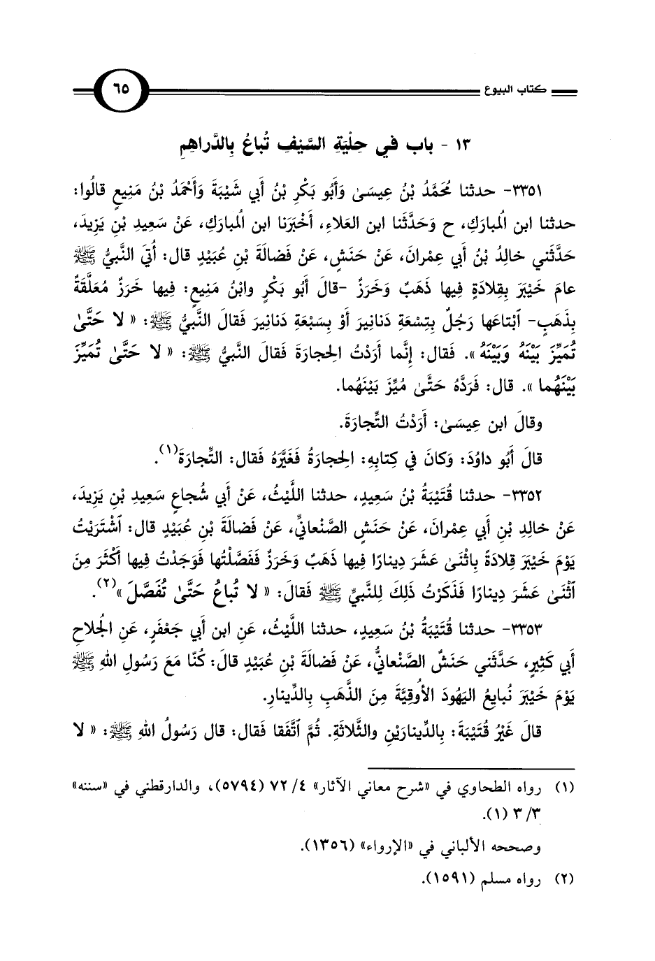 3351 - حدثنا مُحَمَّدُ بْنُ عِيسَى وَأَبُو بَكْرِ بْنُ أَبي شَيْبَةَ وَأَحْمَدُ بْنُ مَنِيعٍ قالُوا: حدثنا ابن المُبارَكِ، ح وَحَدَّثَنا ابن العَلاءِ، أَخْبَرَنا ابن المُبارَكِ، عَنْ سَعِيدِ بْنِ يَزِيدَ، حَدَّثَني خالِدُ بْن أَبى عِمْرانَ، عَنْ حَنَشٍ، عَنْ فَضالَةَ بْنِ عُبَيدٍ قال: أُتي النَّبيُّ - صلى الله عليه وسلم - عامَ خَيْبَرَ بِقِلادَةٍ فِيها ذَهَبٌ وَخَرَزٌ - قالَ أَبُو بَكْرٍ وابْنُ مَنِيعٍ: فِيها خَرَزٌ مُعَلَّقَةً بِذَهَبٍ - ابْتاعَها رَجُلٌ بِتِسْعَةِ دَنانِيرَ أَوْ بِسَبْعَةِ دَنانِيرَ فَقالَ النَّبيُّ - صلى الله عليه وسلم -: "لا حَتَّى تُمَيِّزَ بَيْنَهُ وَبَيْنَهُ". فَقال: إِنَّما أَرَدْتُ الِحجارَةَ فَقالَ النَّبىُّ - صلى الله عليه وسلم -: "لا حَتَّى تُمَيِّزَ بَيْنَهُما". قال: فَرَدَّهُ حَتَّى مُيِّزَ بَيْنَهُما.