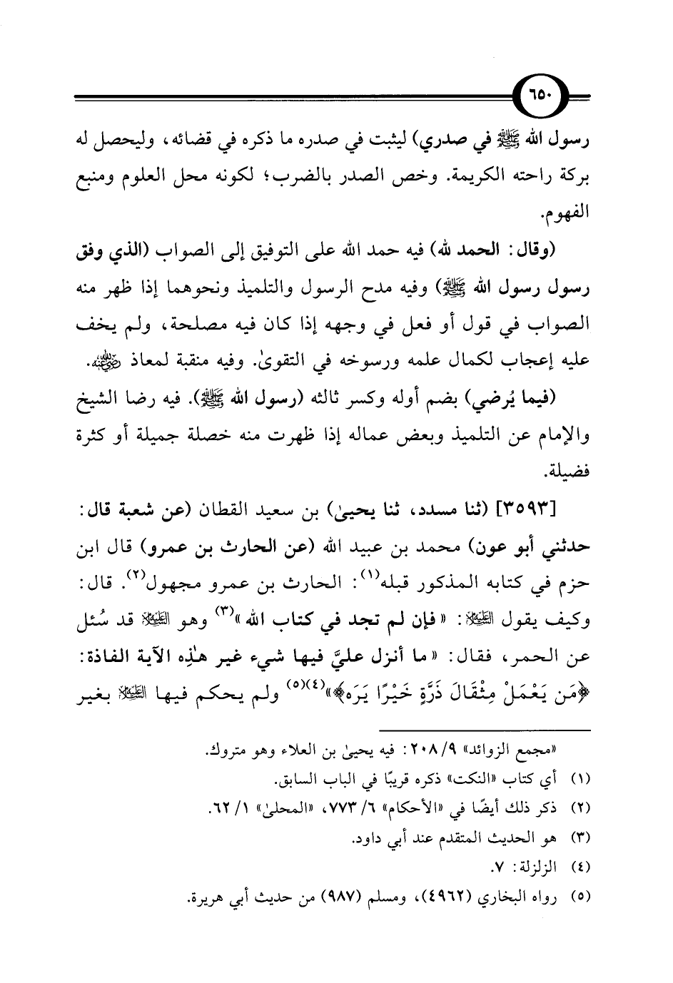 [3593] (ثنا مسدد، ثنا يحيى) بن سعيد القطان (عن شعبة قال: حدثني أبو عون) محمد بن عبيد الله (عن الحارث بن عمرو) قال ابن حزم في كتابه المذكور قبله (¬1): الحارث بن عمرو مجهول (¬2). قال: وكيف يقول -عليه السلام-: "فإن لم تجد في كتاب الله" (¬3) وهو -عليه السلام- قد سُئل عن الحمر، فقال: "ما أنزل عليَّ فيها شيء غير هذِه الآية الفاذة: {مَنْ يَعْمَلْ مِثْقَالَ ذَرَّةٍ خَيْرًا يَرَهُ} " (¬4) (¬5) ولم يحكم فيها -عليه السلام- بغير