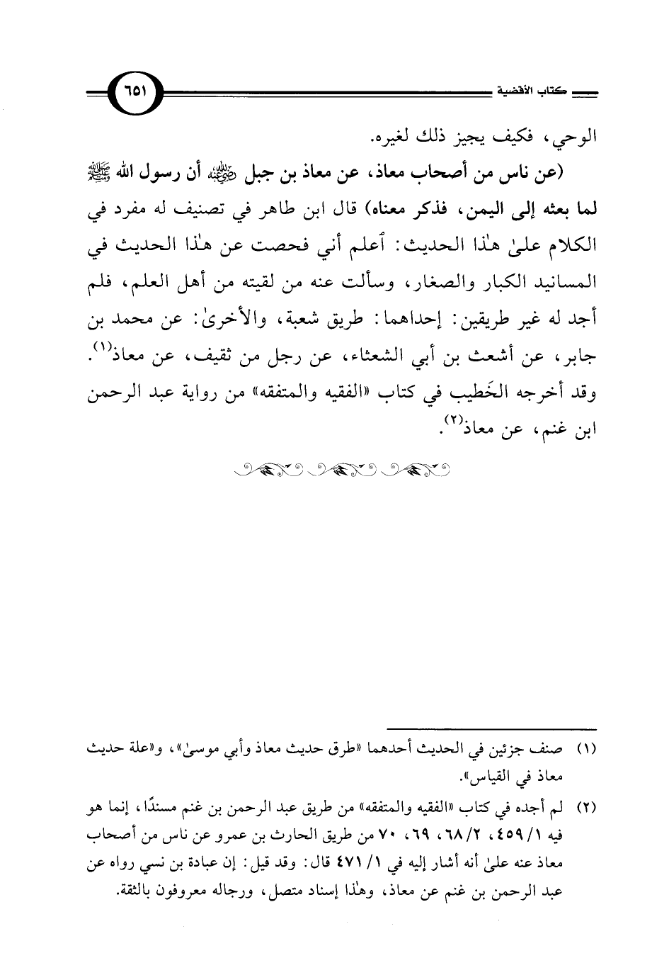 (¬2) لم أجده في كتاب "الفقيه والمتفقه" من طريق عبد الرحمن بن غنم مسندًا، إنما هو فيه 1/ 459، 2/ 68، 69، 70 من طريق الحارث بن عمرو عن ناس من أصحاب معاذ عنه على أنه أشار إليه في 1/ 471 قال: وقد قيل: إن عبادة بن نسي رواه عن عبد الرحمن بن غنم عن معاذ، وهذا إسناد متصل، ورجاله معروفون بالثقة.