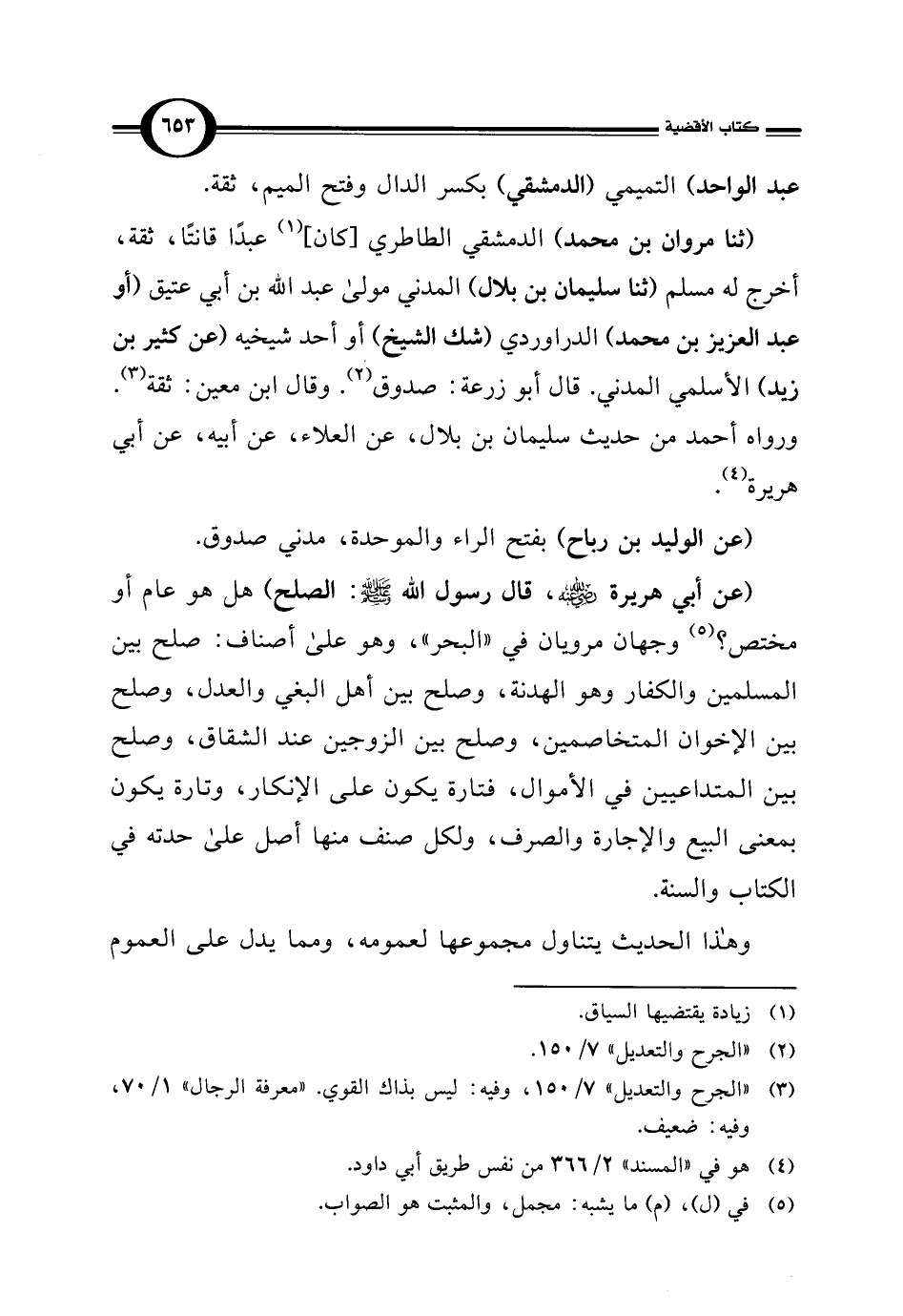(عن أبي هريرة -رضي الله عنه-، قال رسول الله - صلى الله عليه وسلم -: الصلح) هل هو عام أو مختص؟ (¬5) وجهان مرويان في "البحر"، وهو على أصناف: صلح بين المسلمين والكفار وهو الهدنة، وصلح بين أهل البغي والعدل، وصلح بين الإخوان المتخاصمين، وصلح بين الزوجين عند الشقاق، وصلح بين المتداعيين في الأموال، فتارة يكون على الإنكار، وتارة يكون بمعنى البيع والإجارة والصرف، ولكل صنف منها أصل على حدته في الكتاب والسنة.