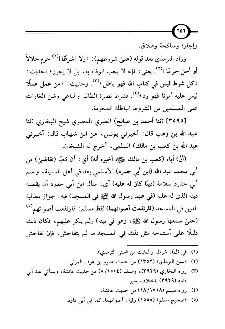وزاد الترمذي بعد قوله (على شروطهم): "إلا [شرطًا] (¬1) حرم حلالًا أو أحل حراماً" (¬2). يعني: فإنَّه لا يجب الوفاء به، بل لا يجوز؛ لحديث: "كل شرط ليس في كتاب الله فهو باطل" (¬3). وحديث: "من عمل عملًا ليس عليه أمرنا فهو رد" (¬4). فشرط نصرة الظالم والباغي وشن الغارات على المسلمين من الشروط الباطلة المحرمة.