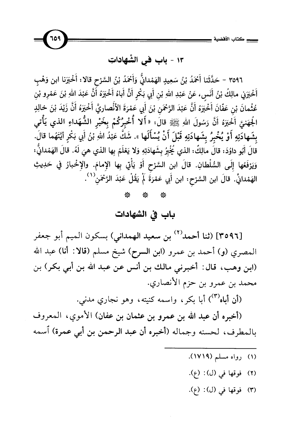 3596 - حَدَّثَنا أَحْمَدُ بْنُ سَعِيدٍ الهَمْداني وَأَحْمَدُ بْن السَّرْحِ قالا: أَخْبَرَنا ابن وَهْبٍ أَخْبَرَني مالِكُ بْنُ أَنَسٍ، عَنْ عَبْدِ اللهِ بْنِ أَبي بَكْرٍ أَنَّ أَباهُ أَخْبَرَهُ أَنَّ عَبْدَ اللهِ بْنَ عَمْرِو بْنِ عثْمانَ بْنِ عَفّانَ أَخْبَرَهُ أَنَّ عَبْدَ الرَّحْمَنِ بْنَ أَبي عَمْرَةَ الأنصاريَّ أَخْبَرَه أَنَّ زَيْدَ بْنَ خالِد الجهَنىِّ أَخْبَرَهُ أَنَّ رَسُولَ اللهِ - صلى الله عليه وسلم - قالَ: "أَلا أُخْبِرُكُمْ بِخَيْرِ الشُّهَداءِ الذي يَأْتي بِشَهادَتِهِ أَوْ يُخْبِرُ بِشَهادَتِهِ قَبْلَ أَنْ يُسْأَلَها". شَكَّ عَبْد اللهِ بْنُ أَبي بَكْرٍ أيَّتَهما قالَ. قالَ أَبُو داوُدَ: قالَ مالِكٌ: الذي يخبِرُ بِشَهادَتِهِ وَلا يَعْلَمُ بِها الذي هيَ لَهُ. قالَ الهَمْداني: وَيَرْفَعها إِلَى السّلْطانِ. قالَ ابن السَّرحِ أَوْ يَأْتي بِها الإِمامَ. والإِخْبارُ في حَدِيثِ الهَمْداني. قالَ ابن السَّرْحِ: ابن أَبي عَمْرَةَ لم يقلْ عَبْدَ الرَّحْمَنِ (¬1).