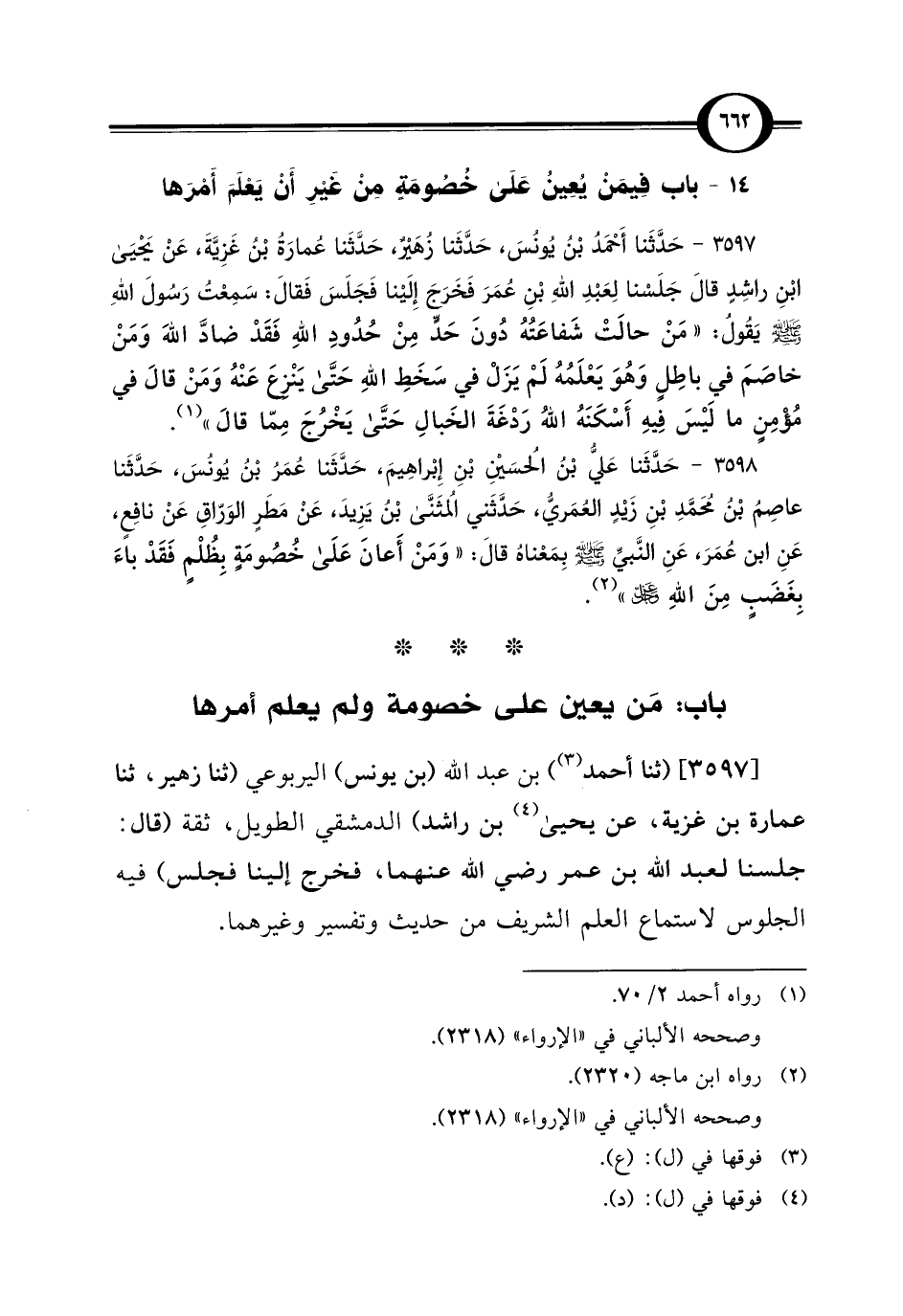 3597 - حَدَّثَنا أَحْمَدُ بْنُ يُونسَ، حَدَّثَنا زُهَيْرٌ، حَدَّثَنا عمارَةُ بْنُ غَزِيَّةَ، عَنْ يَحيَى ابْنِ راشِدٍ قالَ جَلَسْنا لِعَبْدِ اللهِ بْنِ عُمَرَ فَخَرَجَ إِلَيْنا فَجَلَسَ فَقالَ: سَمِعْت رَسولَ اللهِ - صلى الله عليه وسلم - يُقول: "مَن حالَتْ شَفاعَتُهُ دُونَ حَدَّ مِنْ حُدُودِ اللهِ فقَدْ ضادَّ اللهَ وَمَن خاصَمَ في باطِلٍ وَهُوَ يَعْلَمُهُ لَمْ يَزَلْ في سَخَطِ اللهِ حَتَّى يَنْزع عَنْهُ وَمَنْ قالَ في مُؤمِنٍ ما لَيْسَ فِيهِ أَسْكَنَهُ اللهُ رَدْغَةَ الخَبالِ حَتَّى يَخْرُجَ مِمَّا قالَ" (¬1).