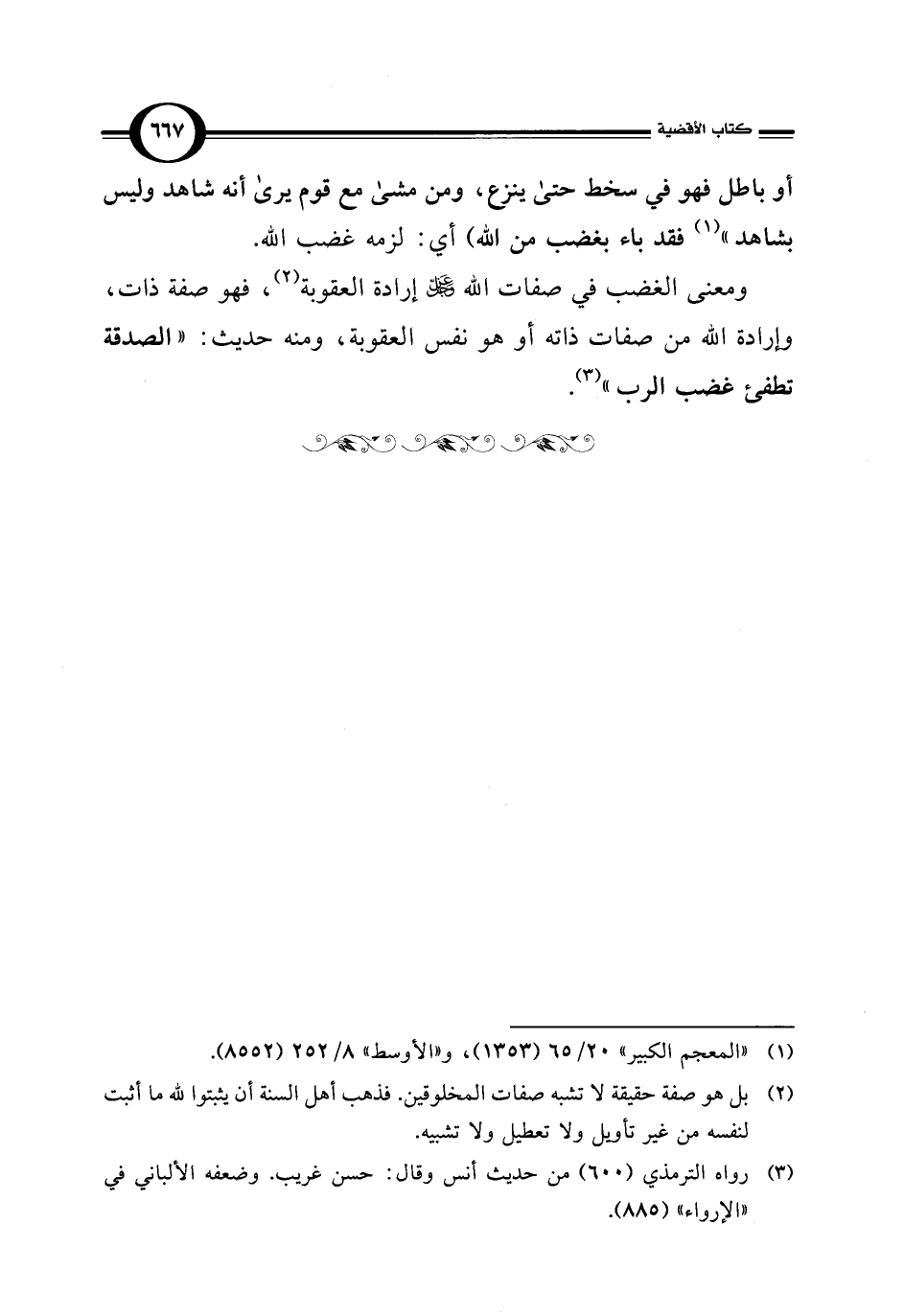 ومعنى الغضب في صفات الله -عَزَّ وَجَلَّ-؛ إرادة العقوبة (¬2)، فهو صفة ذات، وإرادة الله من صفات ذاته أو هو نفس العقوبة، ومنه حديث: "الصدقة تطفئ غضب الرب" (¬3).