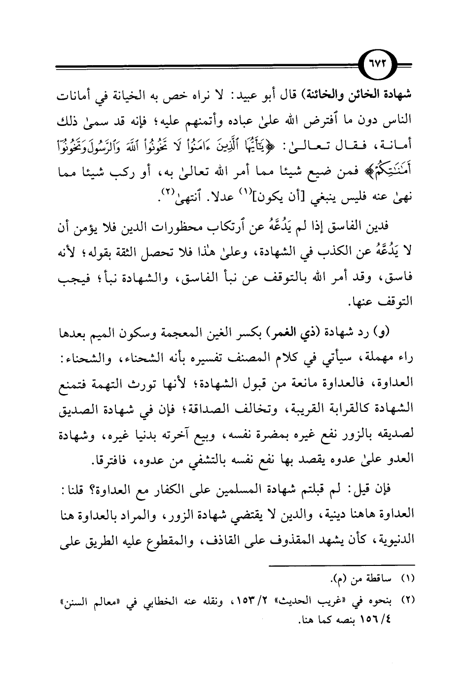 شهادة الخائن والخائنة) قال أبو عبيد: لا نراه خص به الخيانة في أمانات الناس دون ما افترض الله على عباده وأتمنهم عليه؛ فإنَّه قد سمى ذلك أمانة، فقال تعالى: {يَاأَيُّهَا الَّذِينَ آمَنُوا لَا تَخُونُوا اللَّهَ وَالرَّسُولَ وَتَخُونُوا أَمَانَاتِكُمْ} فمن ضيع شيئاً مما أمر الله تعالى به، أو ركب شيئاً مما نهى عنه فليس ينبغي [أن يكون] (¬1) عدلاً. انتهى (¬2).